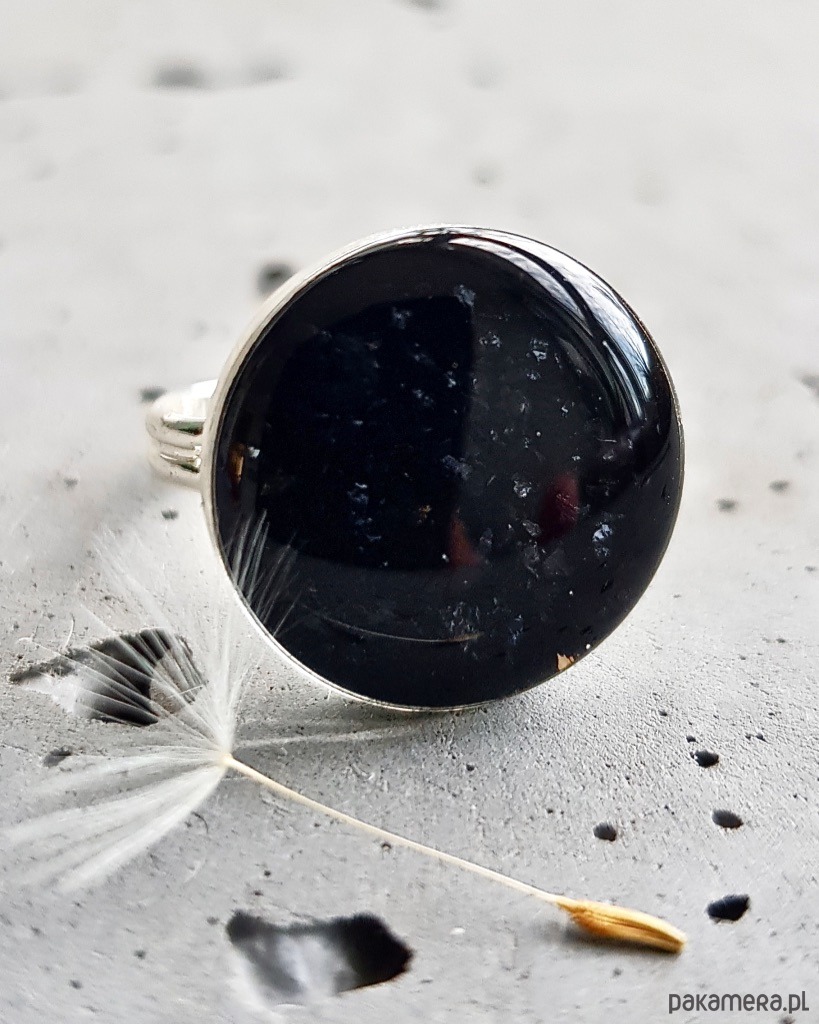 Wyjątkowy pierścionek wykonany w całości ręcznie z żywicy w której na zawsze zatopiłam drobinki węgla. Jest on regulowany i pasuje na każdy palec. Pierścionek przepięknie mieni się w świetle i bardzo efektownie wygląda na palcu. Możesz mieć pewność , że będziesz nosić jedyny w swoim rodzaju pierścionek. To idealny prezent dla ukochanej osoby. Pierścionek jest zapakowany w eleganckim pudełku jubilerskim.