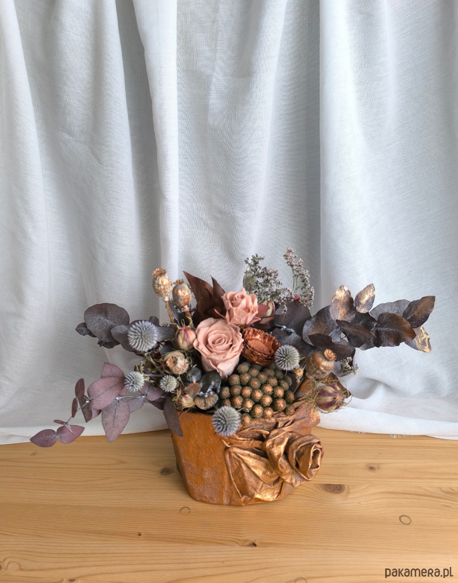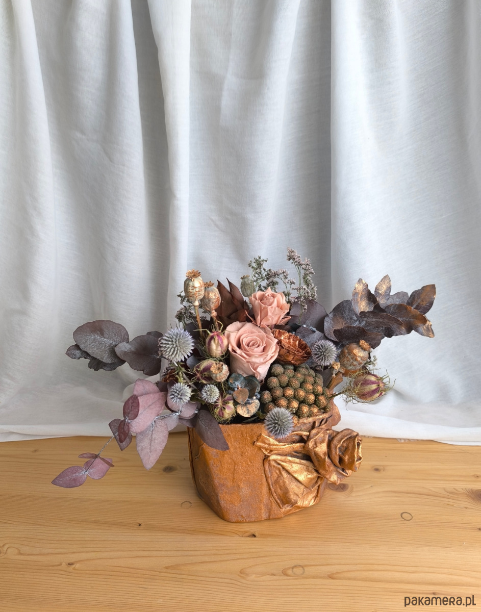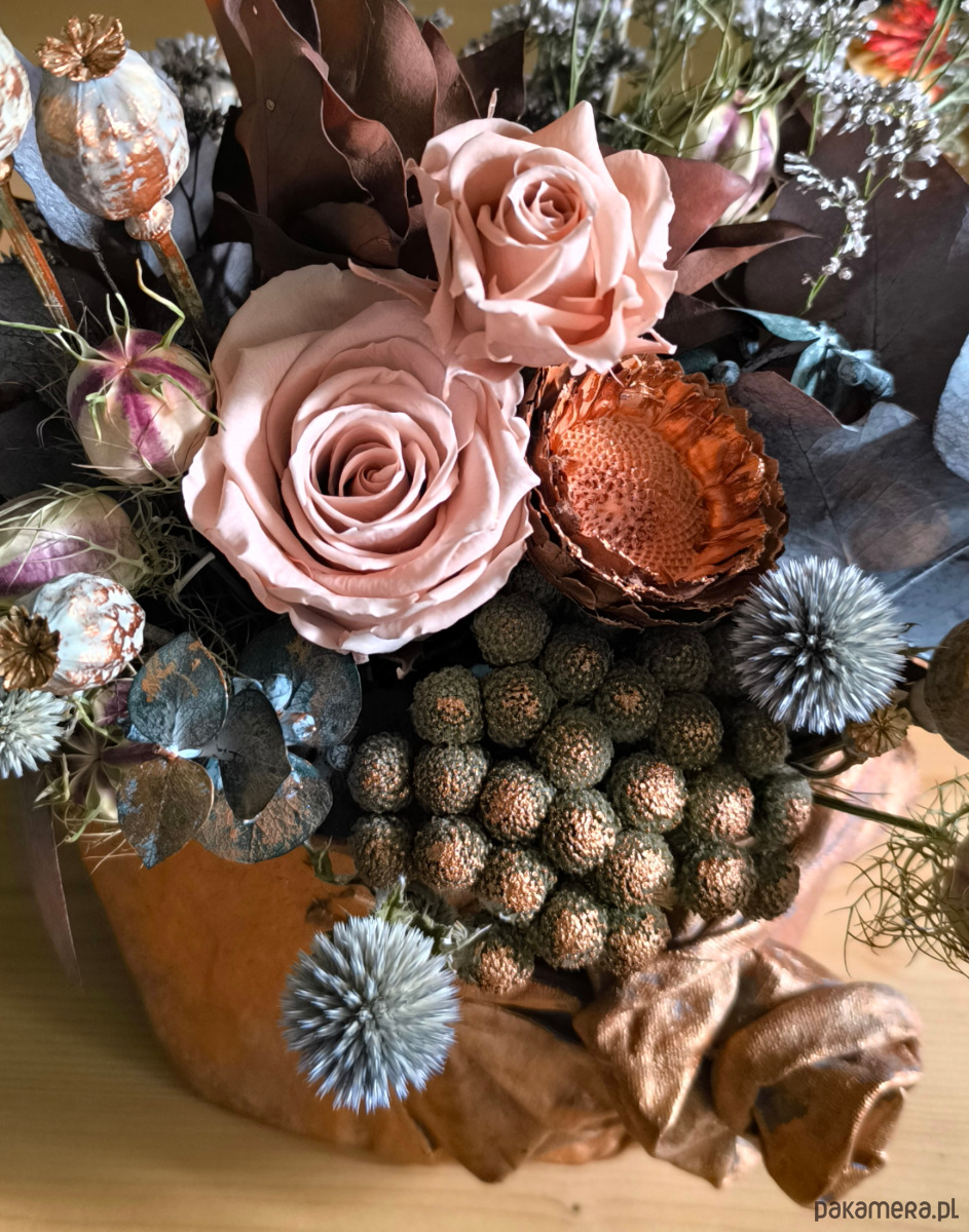 W kompozycji wykorzystano stabilizowaną różę w kolorze jasny toffi, eukaliptus stabilizowany, brunię i makówki delikatnie muśnięte miedzią oraz naturalnie błękitny przegorzan, które tworzą harmonijną, a jednocześnie wyrazistą całość. Metaliczne akcenty pięknie kontrastują z naturalnymi strukturami roślin.