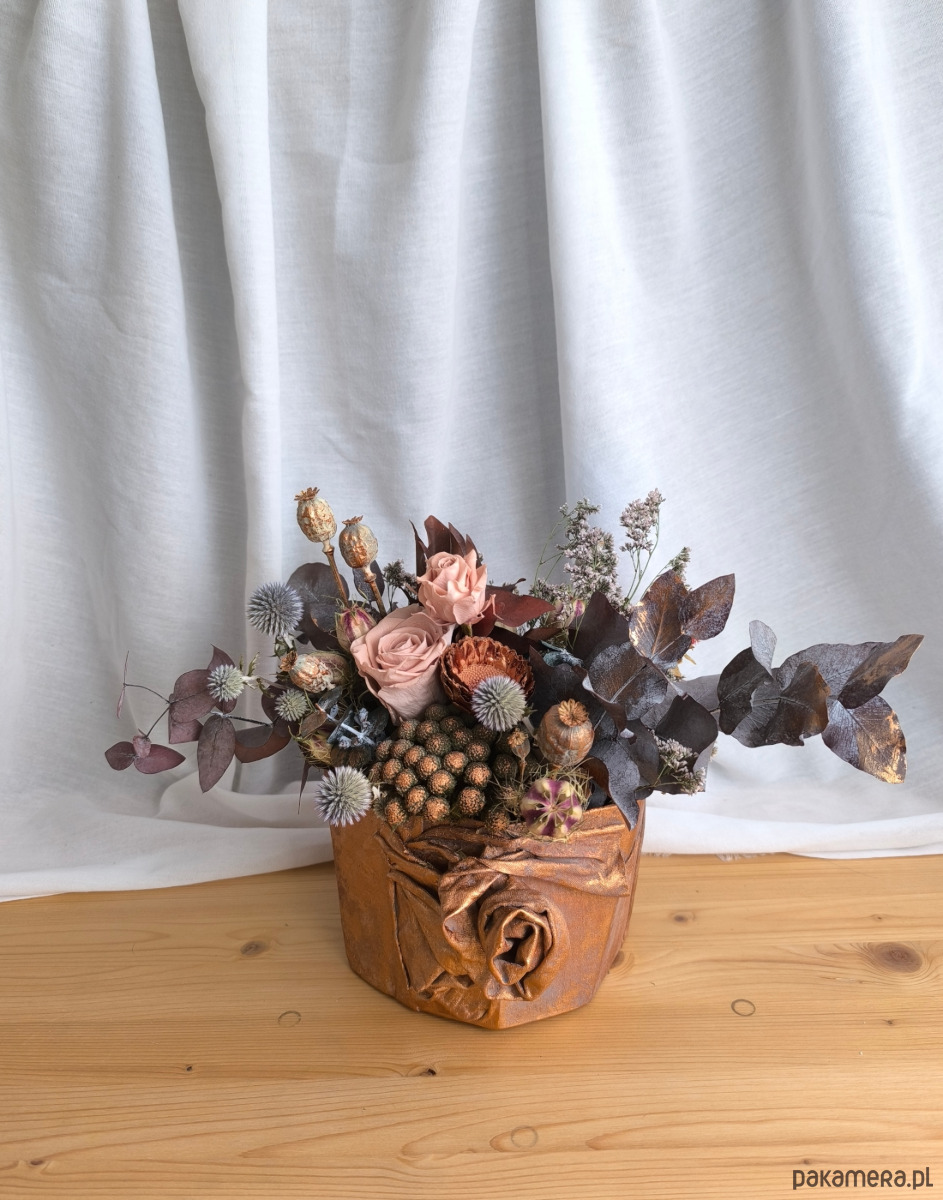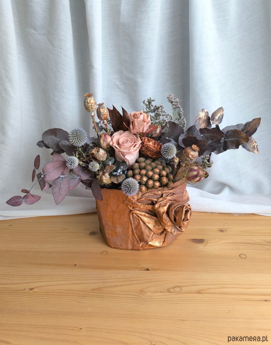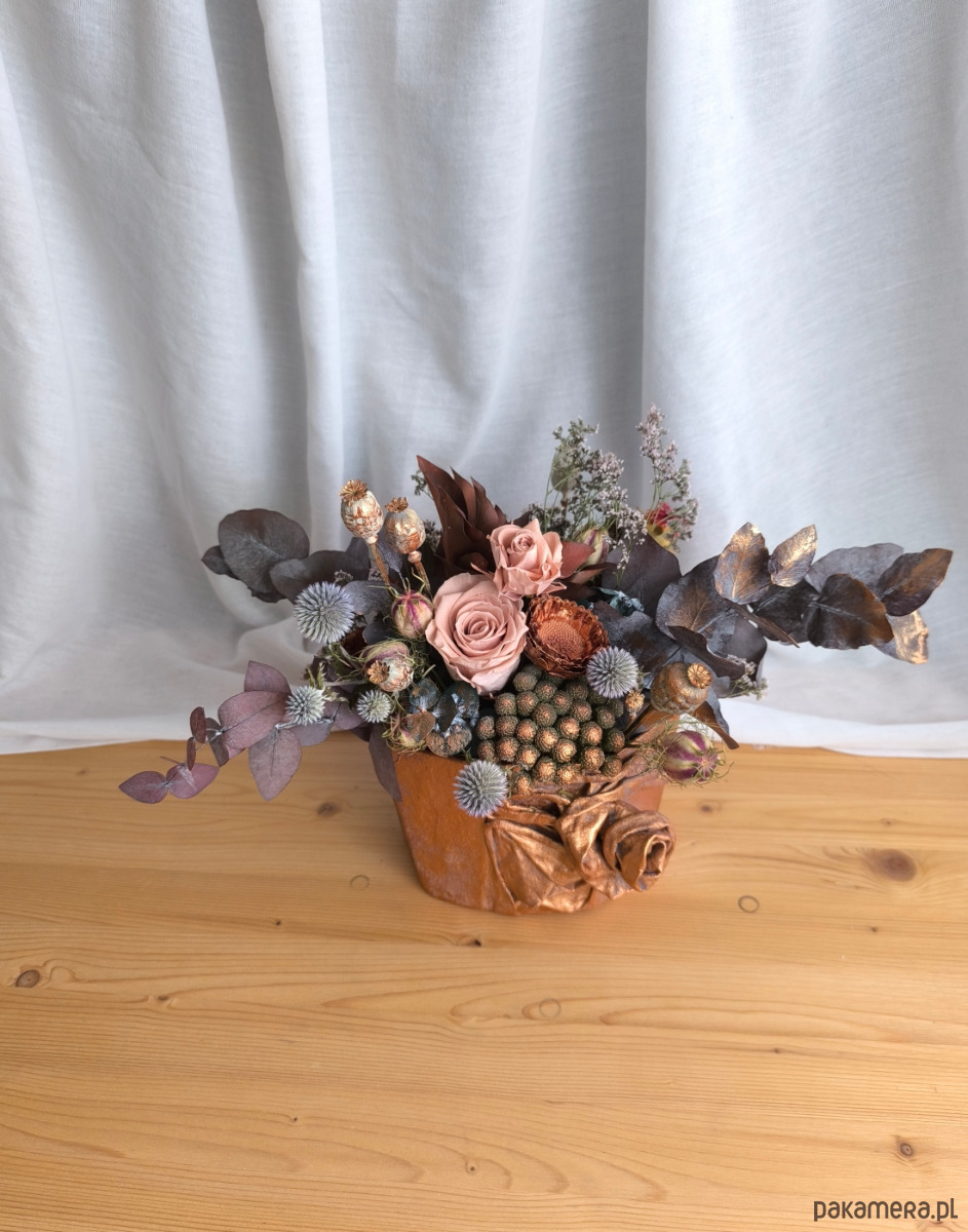 W kompozycji wykorzystano stabilizowaną różę w kolorze jasny toffi, eukaliptus stabilizowany, brunię i makówki delikatnie muśnięte miedzią oraz naturalnie błękitny przegorzan, które tworzą harmonijną, a jednocześnie wyrazistą całość. Metaliczne akcenty pięknie kontrastują z naturalnymi strukturami roślin.