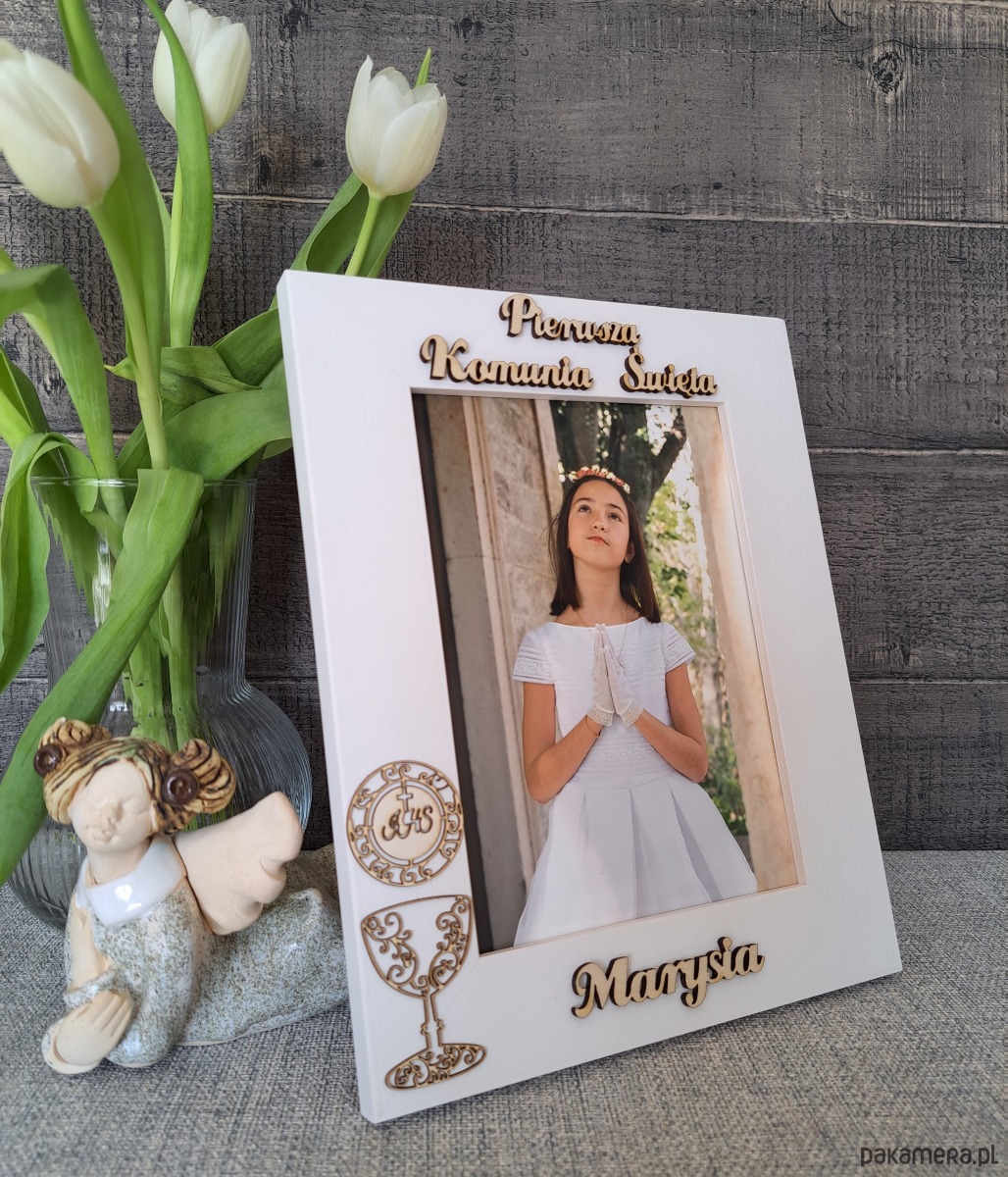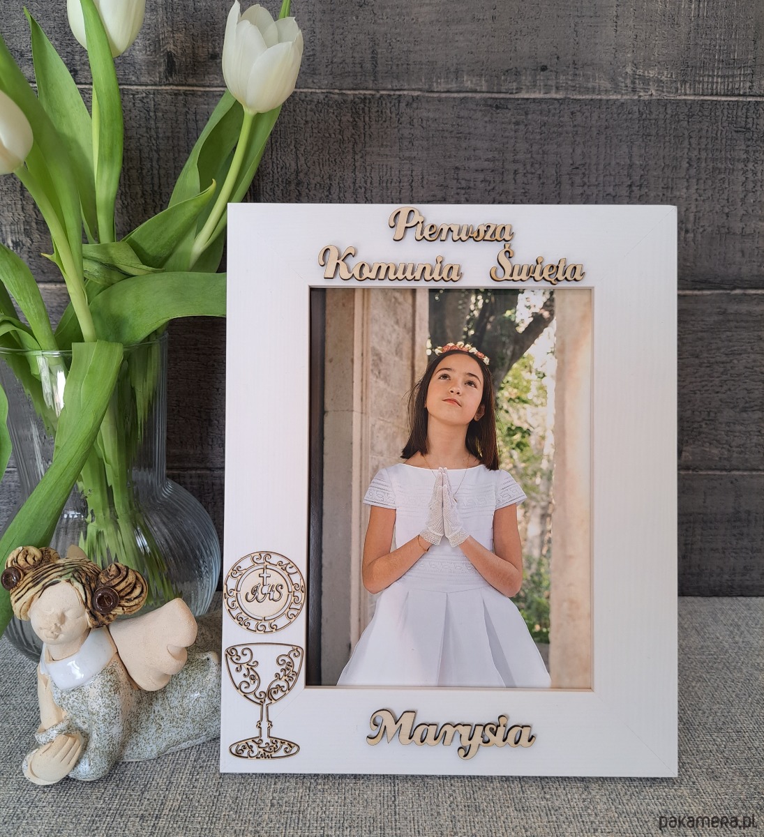 Aby podkreślić wyjątkowy charakter ramki umieścimy na niej drewniany napis-Pierwsza Komunia Święta, dekor w kształcie Kielicha z Hostią oraz imię dziecka przystępującego do Pierwszej Komunii.