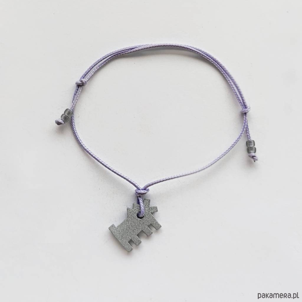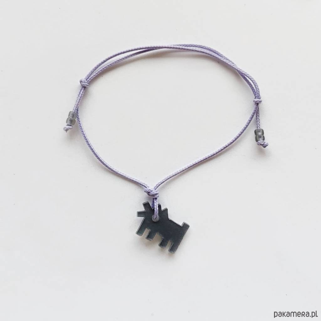 PIESEK bransoletka- zabawny dodatek. Ciekawy dodatek przykuwają uwagę i zaskakuje wzornictwem. Taka bransoletka sprawi, że każda stylizacja nabierze niepowtarzalnego, fantazyjnego charakteru. Bransoletka wykonana jest z: tworzywo sztuczne, ozdobny sznurek, szklane koraliki. Długość zawieszki 1,7 cm. Szeroko - 1,3cm. Zdjęcia wykonane z dwóch stron zawieszki.