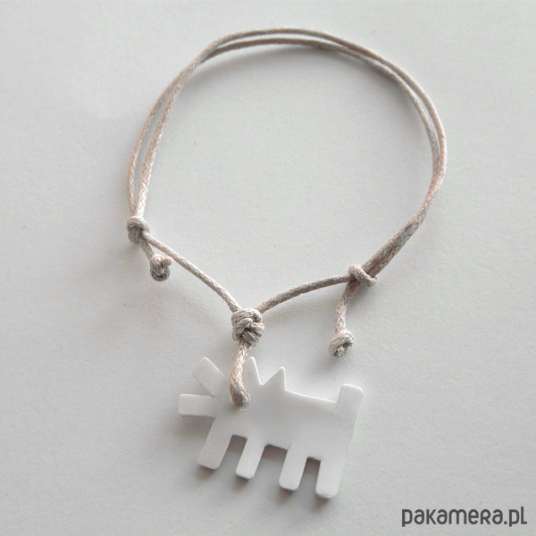 PIESEK bransoletka- zabawny dodatek. Ciekawy dodatek przykuwają uwagę i zaskakuje wzornictwem. Taka bransoletka sprawi, że każda stylizacja nabierze niepowtarzalnego, fantazyjnego charakteru. Bransoletka wykonana jest z: tworzywo sztuczne, ozdobny sznurek. Tworzywo sztuczne - zmatowione. Długość zawieszki 2,5 cm. Szeroko - 1,5 cm.
