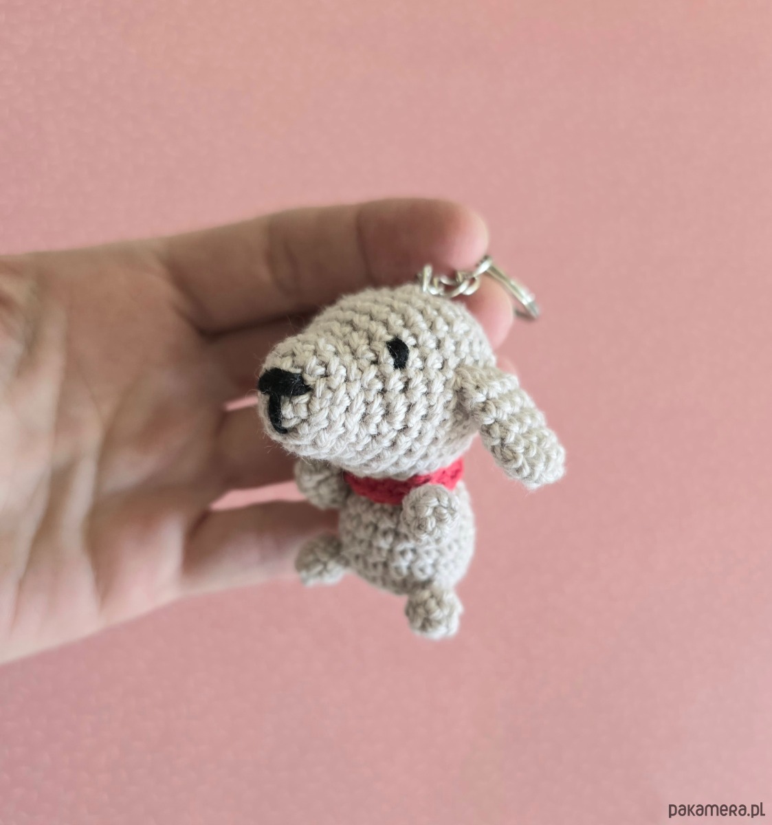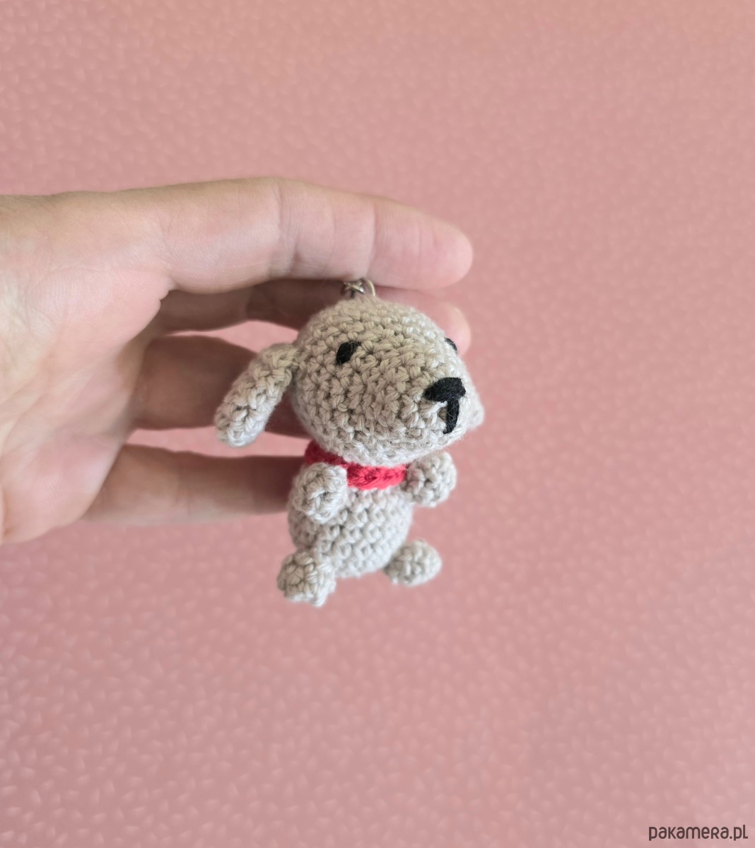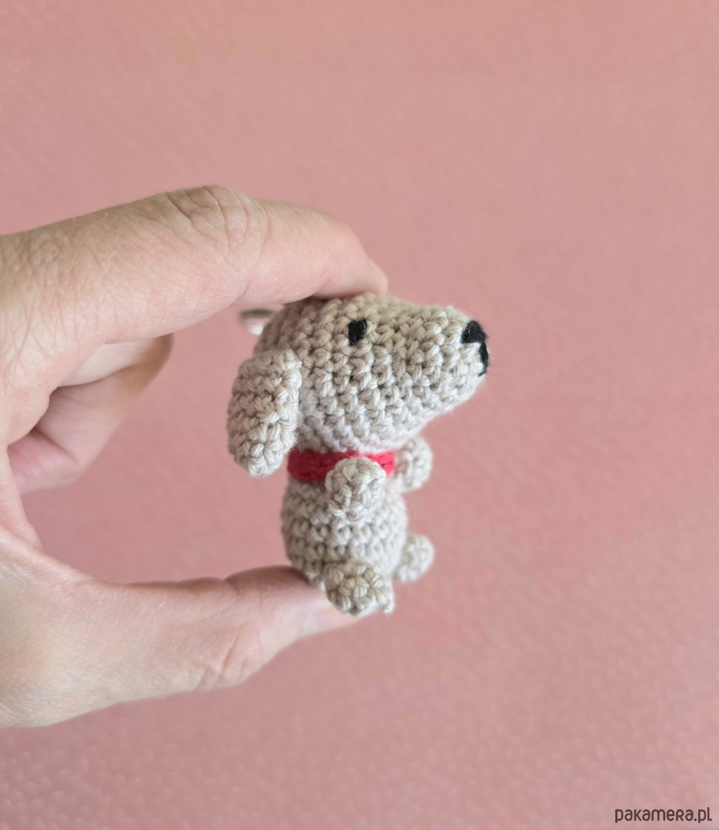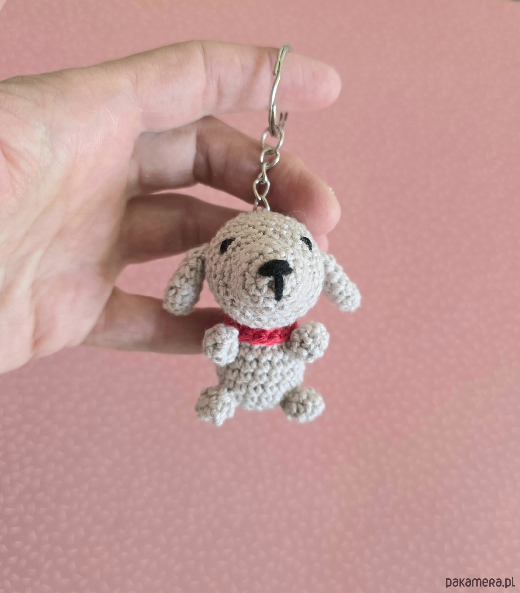 Mały beżowo szary piesek breloczek, który zmieści się w kieszeni i torebce. Piesek ma około 6 cm, wykonany został z bawełnianej włóczki wysokiej jakości z miłością i dbałością o detale.