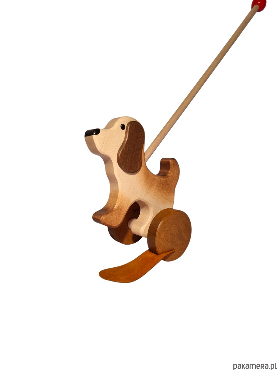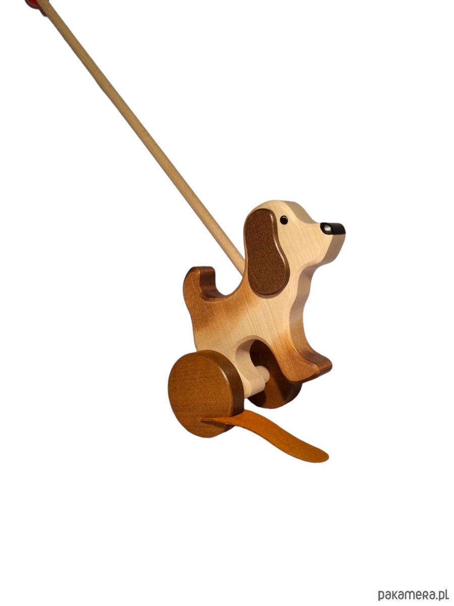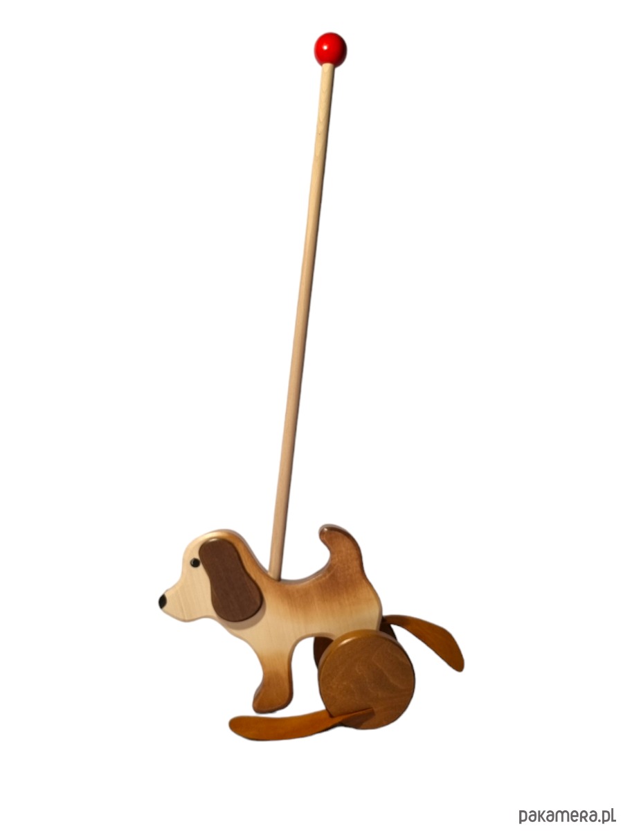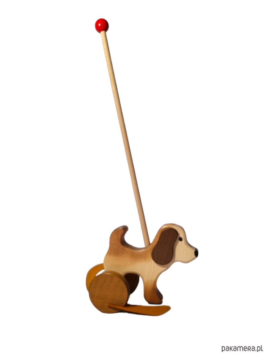 - zestaw składa się z drewnianego pieska, na dwóch kółkach, z przymocowanym z tyłu patykiem, ułatwiającym pchanie zabawki