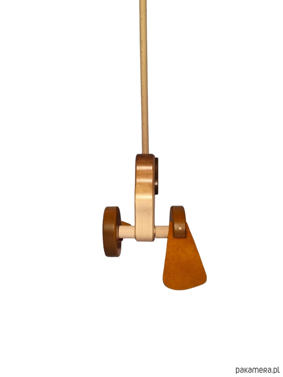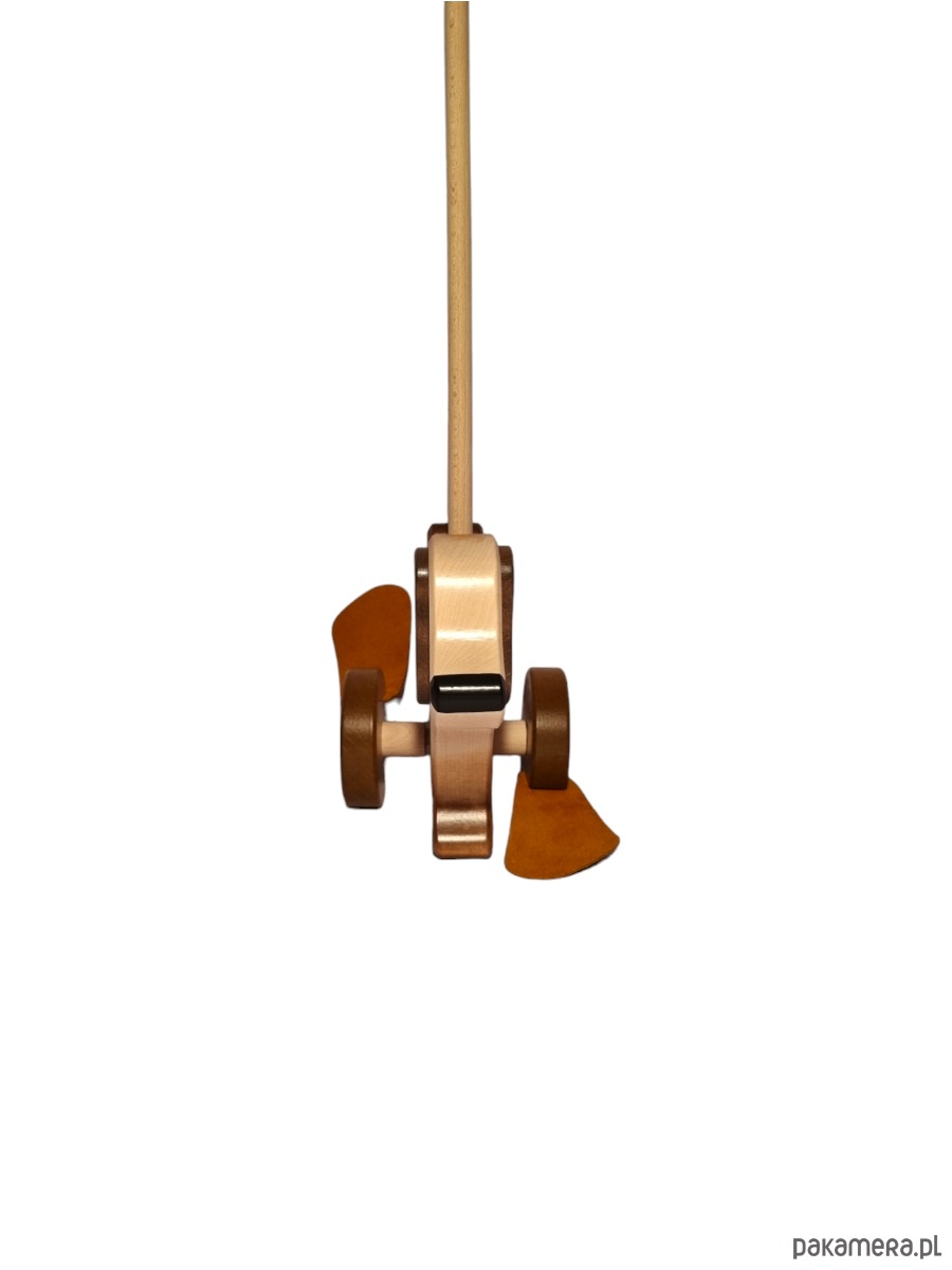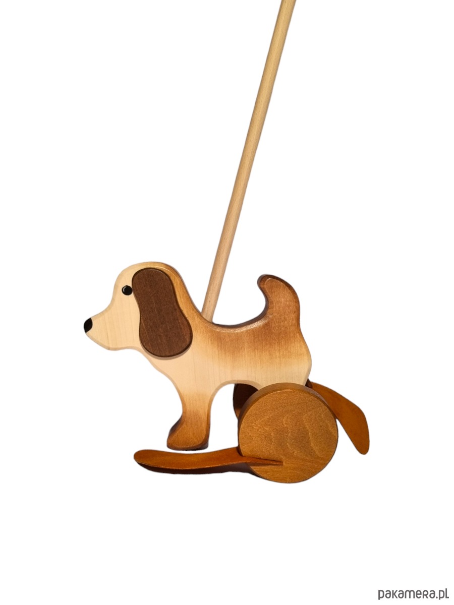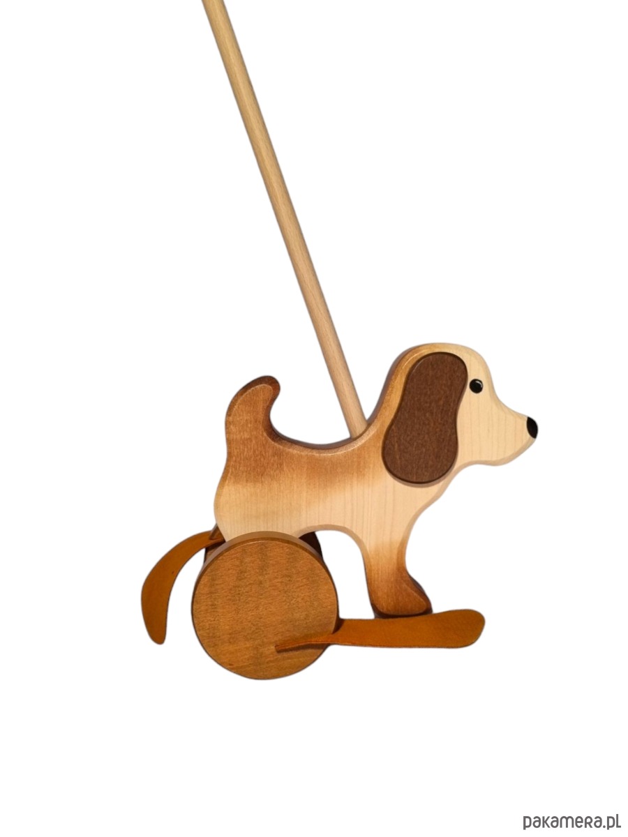 - zestaw składa się z drewnianego pieska, na dwóch kółkach, z przymocowanym z tyłu patykiem, ułatwiającym pchanie zabawki