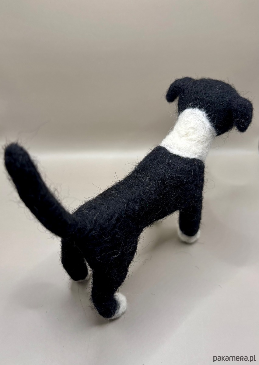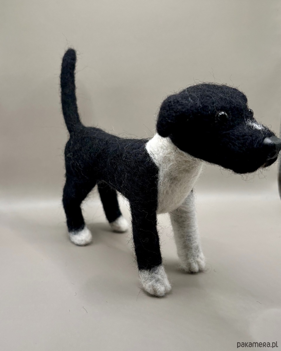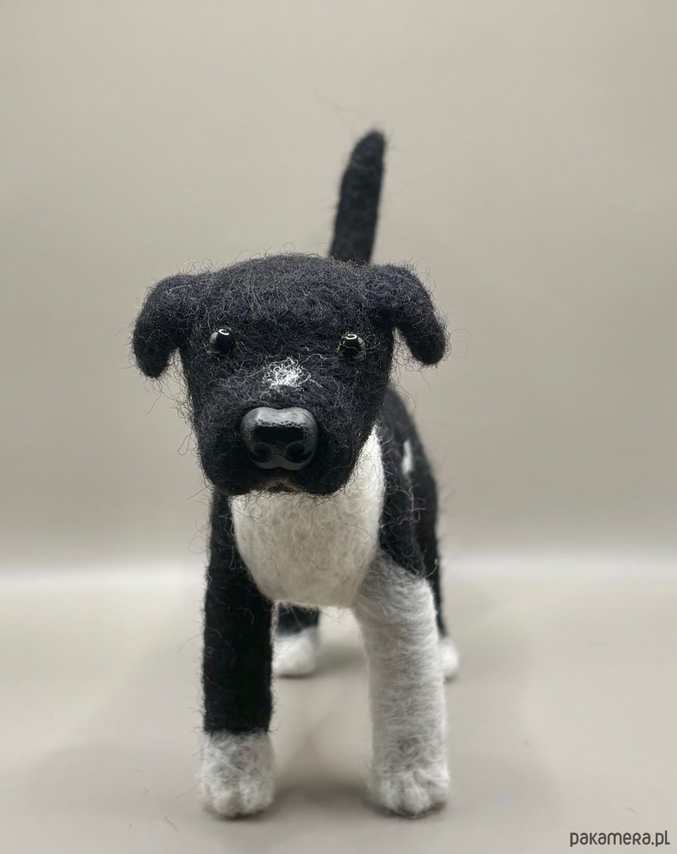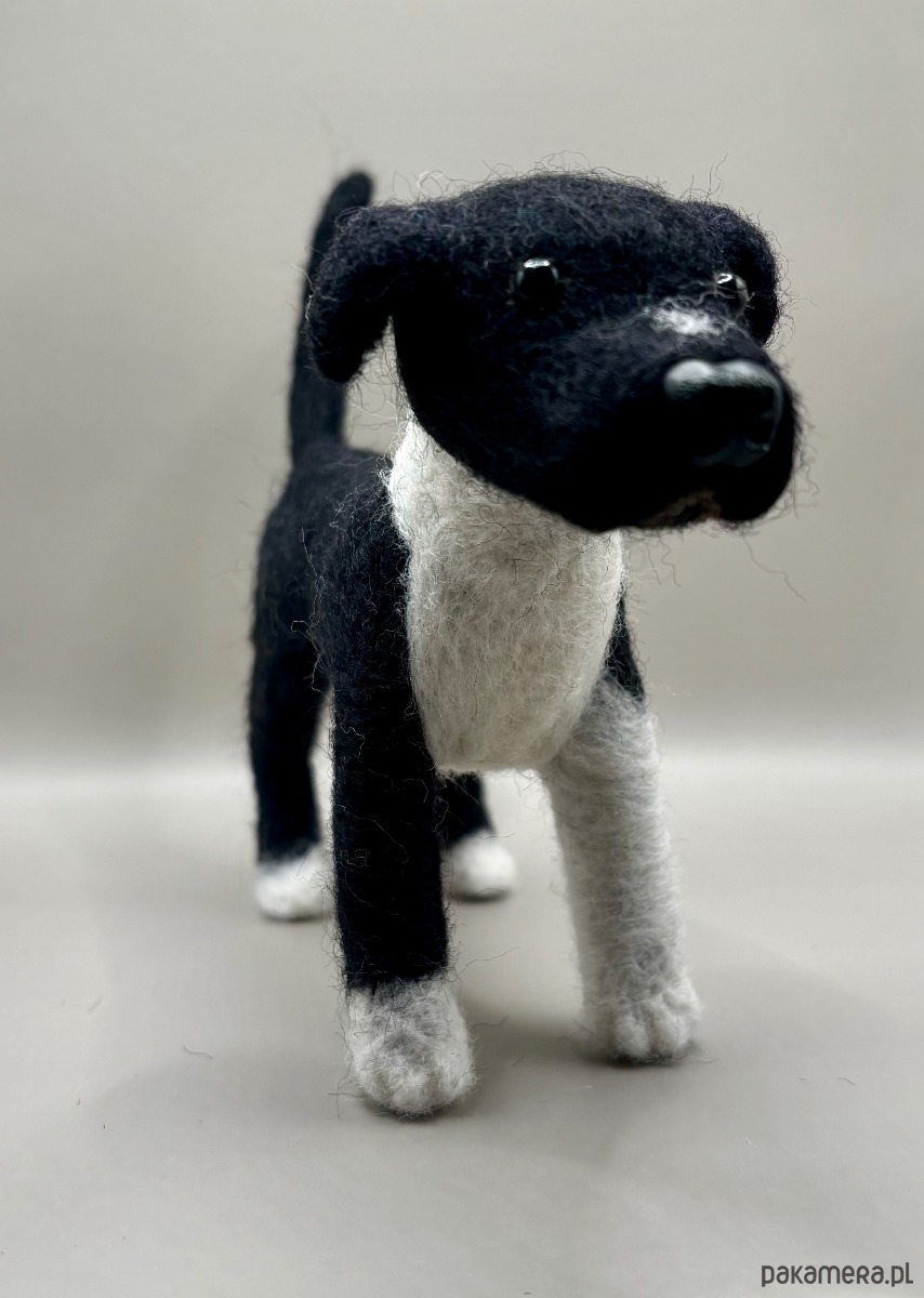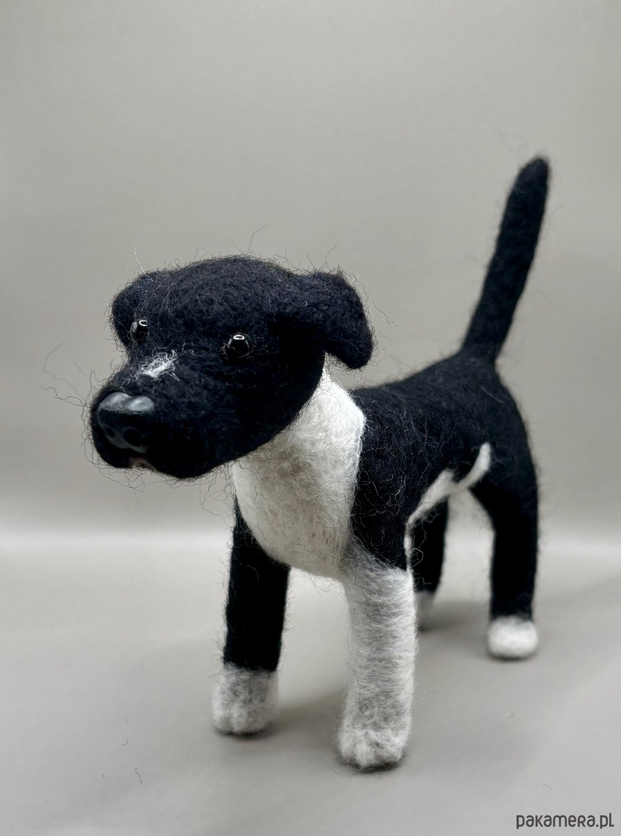 Czarny piesek w białe łatki wykonany na specjalne zamówienie, inspirowany zdjęciem żywego pieska.