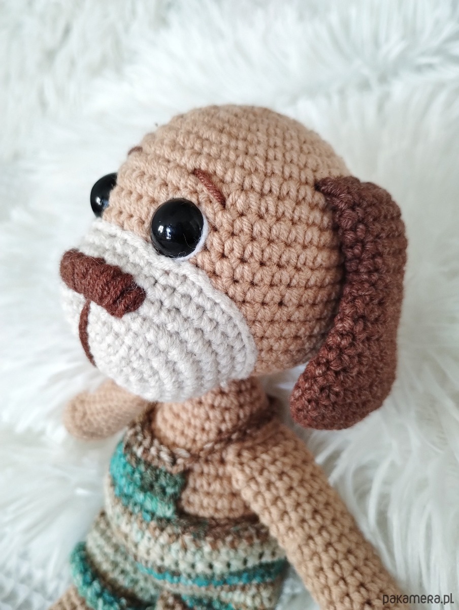 Szydełkowy piesek ze zdejmowanymi spodenkami to urocza zabawka dla każdego malucha.