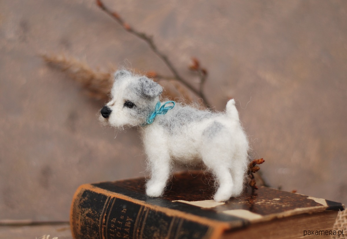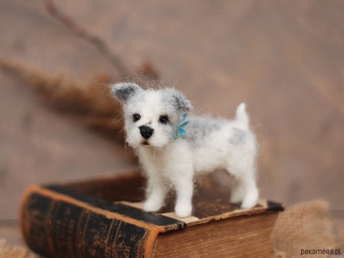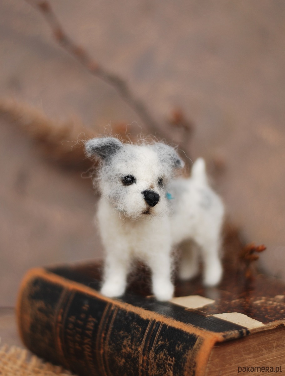Pies wykonany metodą filcowania na sucho z wełny merynos.
