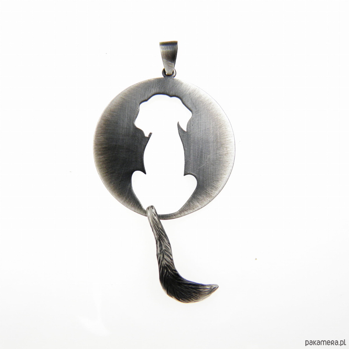 Zawieszka wykonana ze srebra próby 925, przedstawiająca wyciętą w kole sylwetkę pieska z dyndającym ogonkiem.