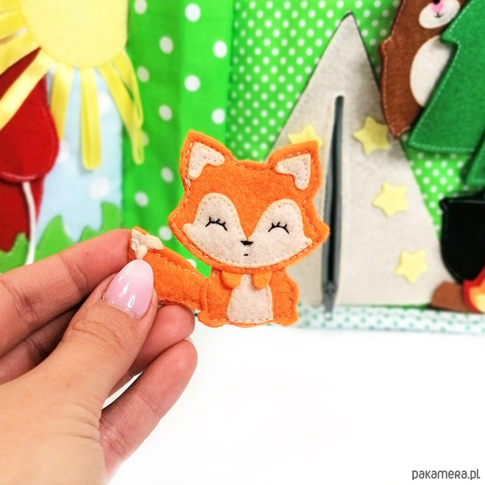 3. las, a w nim miejsce na piknik. Namiot zapinany na suwak, a w nim zwierzaki. Na stronie znajdują się również choinki, które są jednocześnie kieszonkami, oraz garnek na palenisku z rybkami.