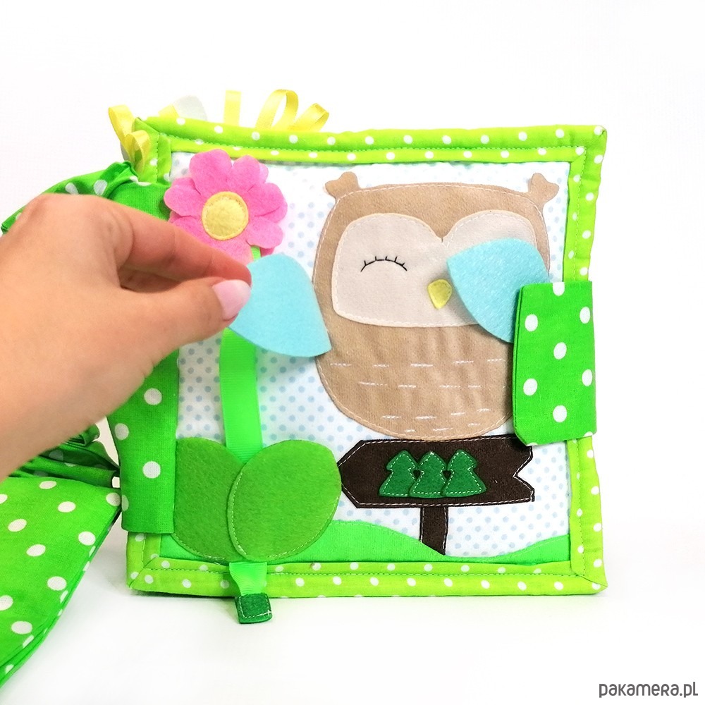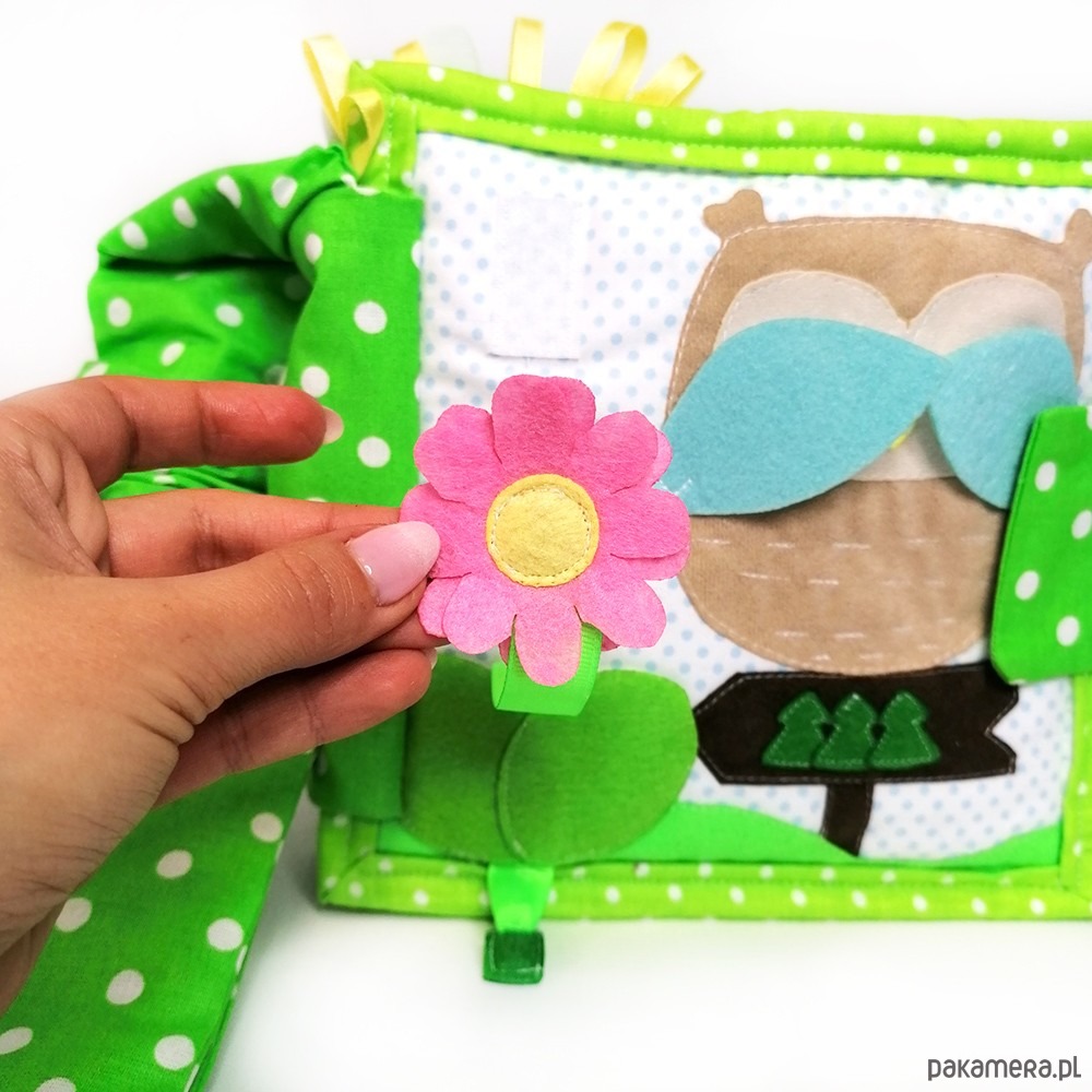 1. sowa ze skrzydełkami zakrywającymi oczy oraz kwiatek wysuwający się zza liści i zapinający na rzep,