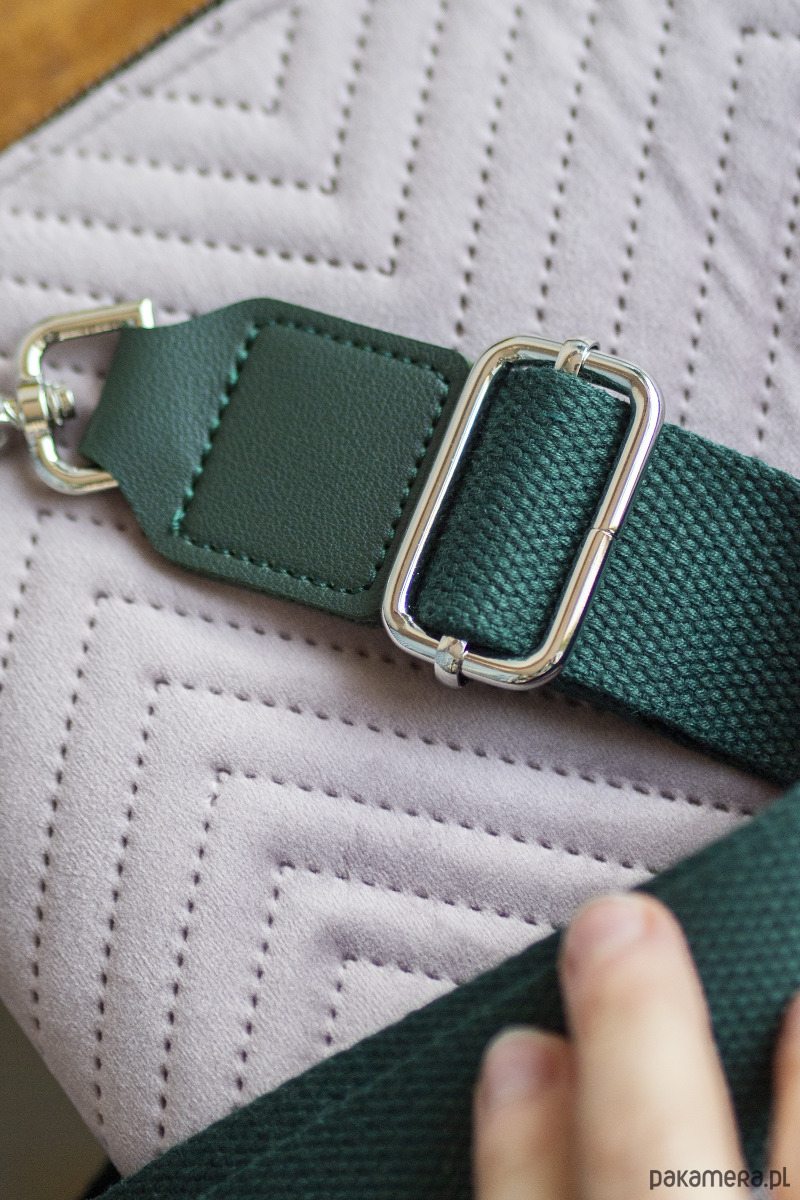 Torebka posiada regulowany zielony pasek i srebrne okucia.