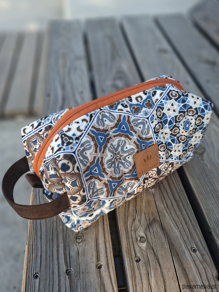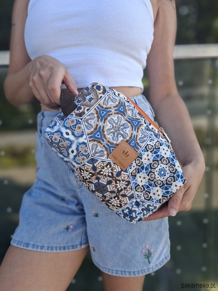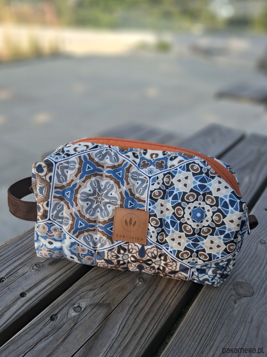 Duża kosmetyczka z weluru w kolorowe kafelki pikowana na grubej owacie.