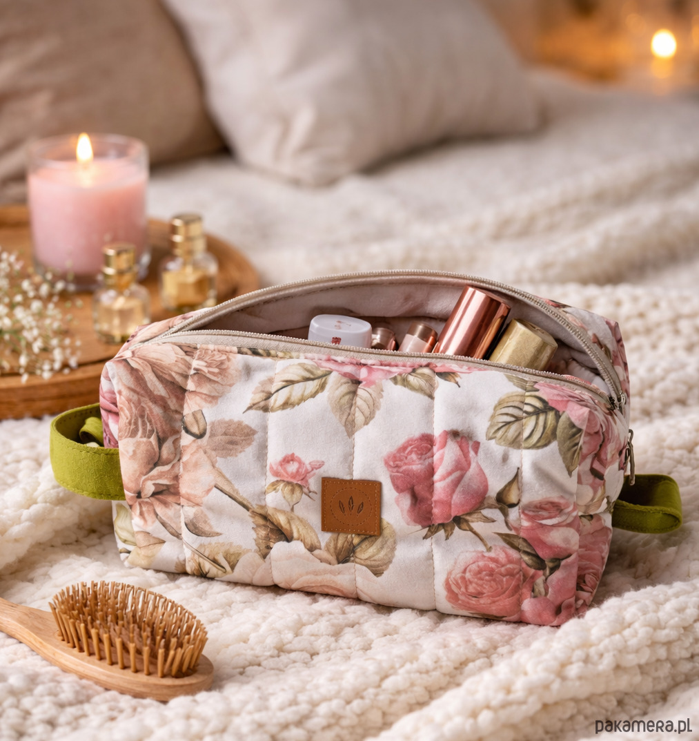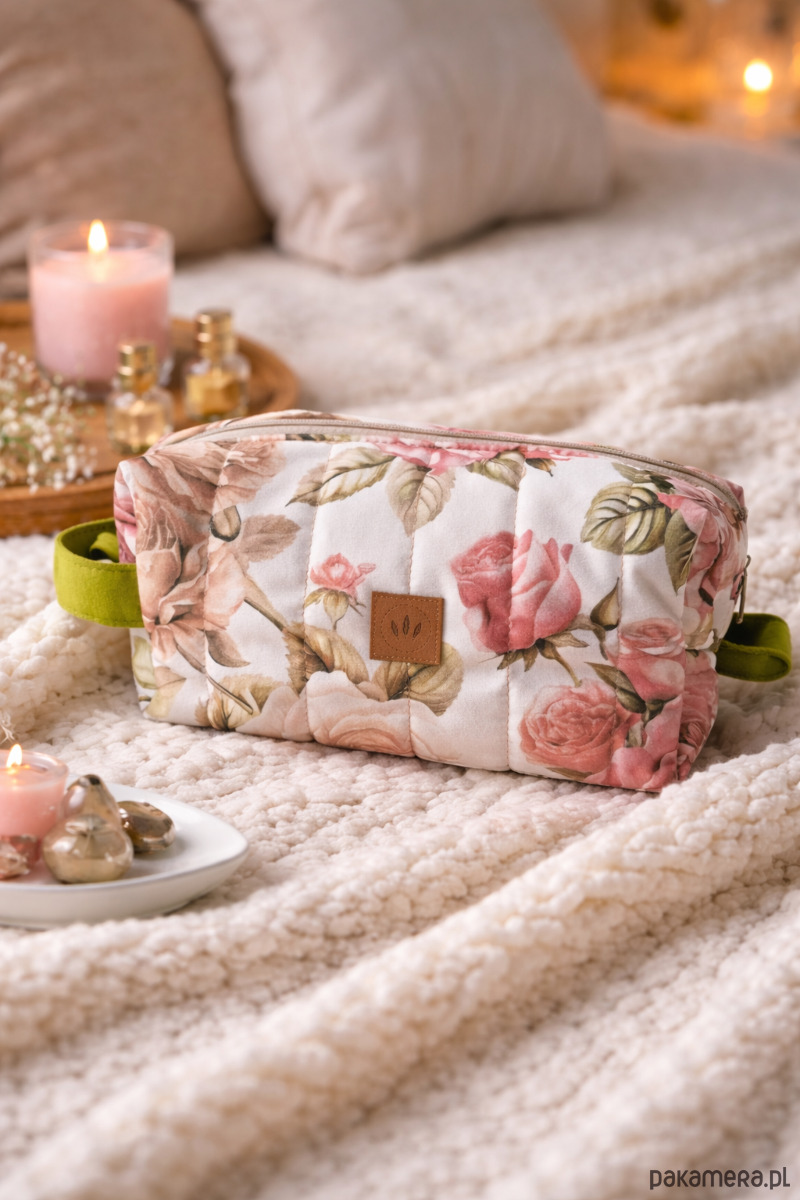 Duża kosmetyczka z weluru w pastelowe róże pikowana na grubej owacie.