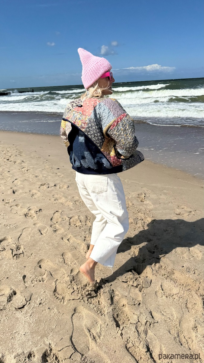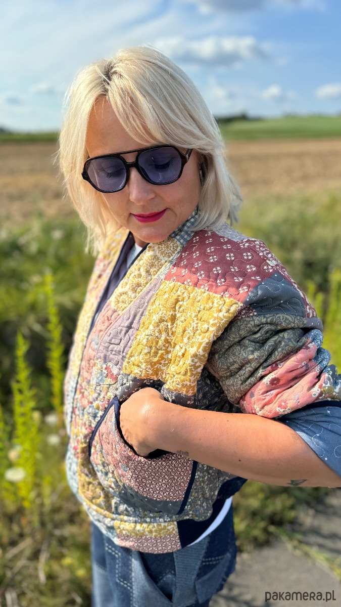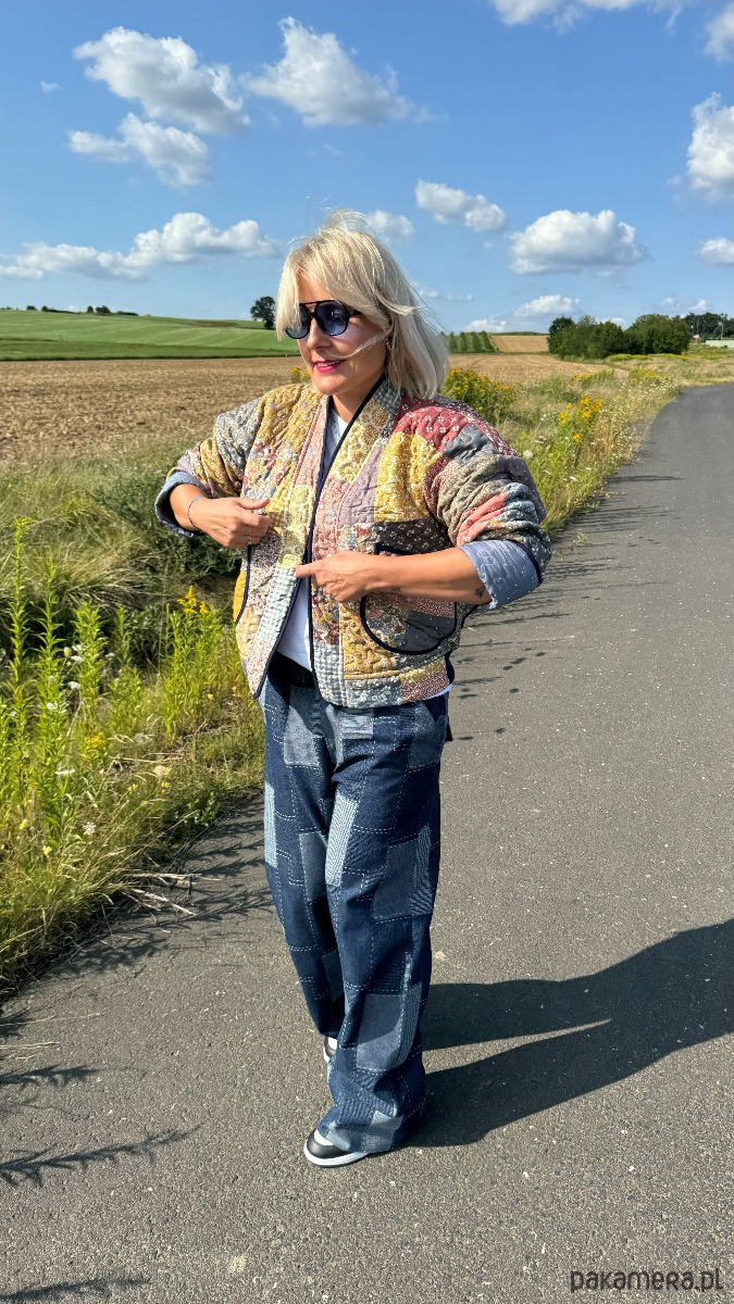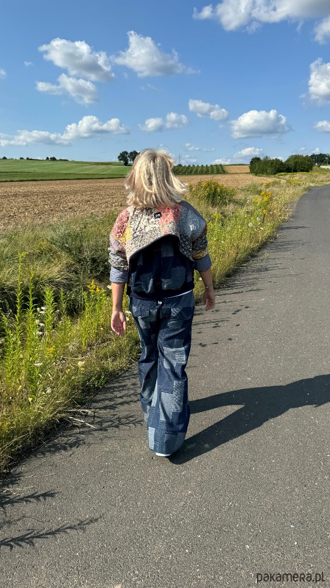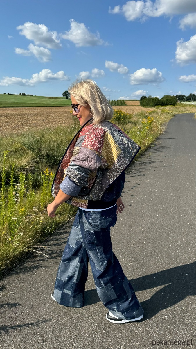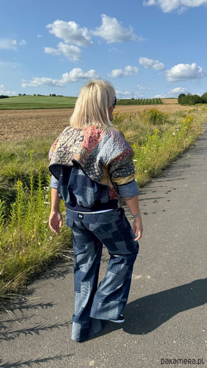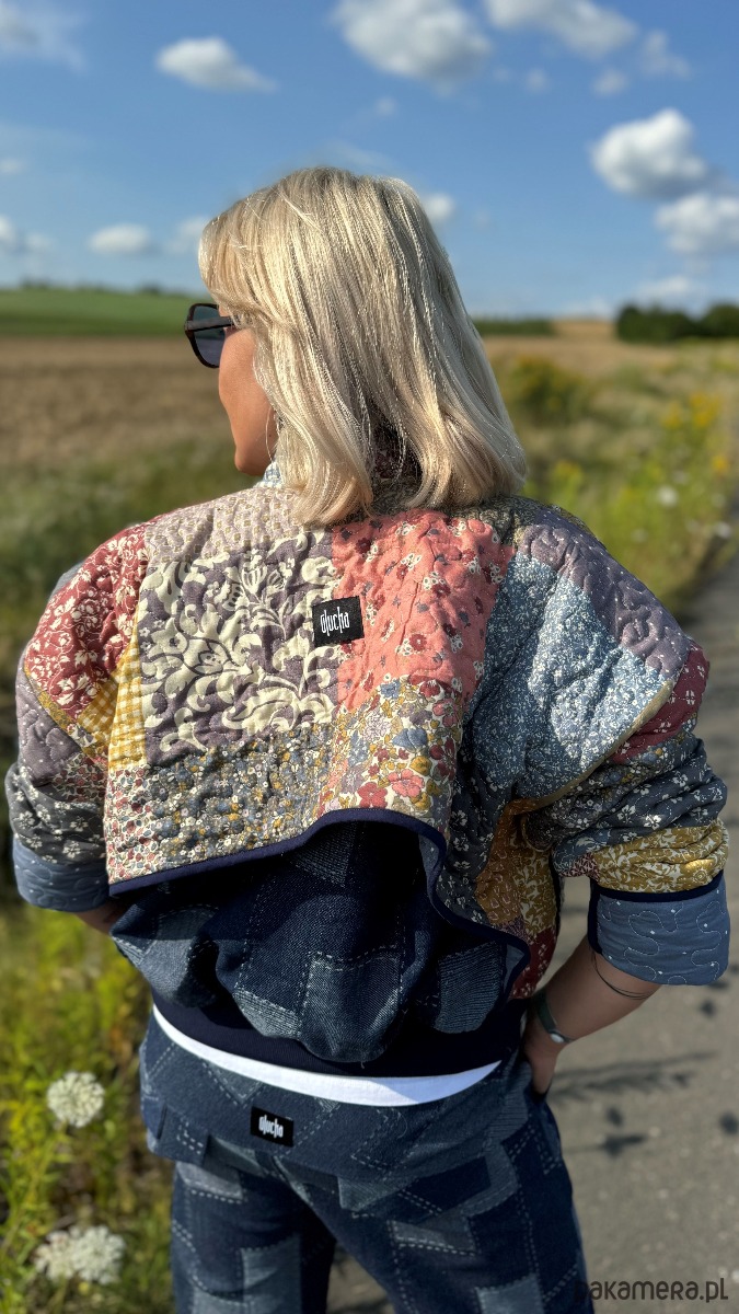 Największą atrakcją jest podwójny tył – wewnętrzna warstwa to jeansowy patchwork, który kontrastuje z bardziej ekstrawagancką zewnętrzną warstwą z pikówki patchworkowej, która jest krótsza i lekko odstaje, tworząc dynamiczną, ciekawą formę. Taki nietypowy krój sprawia, że kurtka wyróżnia się na tle innych, nadając jej unikalnego charakteru.
