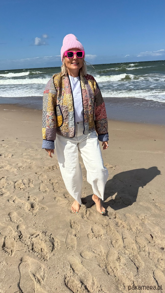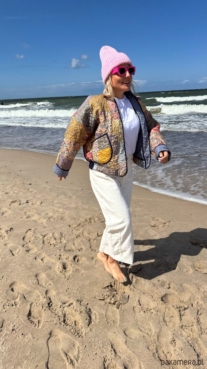 Totalne szaleństwo projektanta! Ta pikowana bomberka to połączenie oryginalności, kreatywności i wyjątkowego designu. Zewnętrzna warstwa to pikówka patchworkowa, która nadaje kurtce charakterystyczny, zróżnicowany wygląd. Z przodu znajdują się dwie duże kieszenie, wykończone lamówką, które łączą funkcjonalność z modowym akcentem.