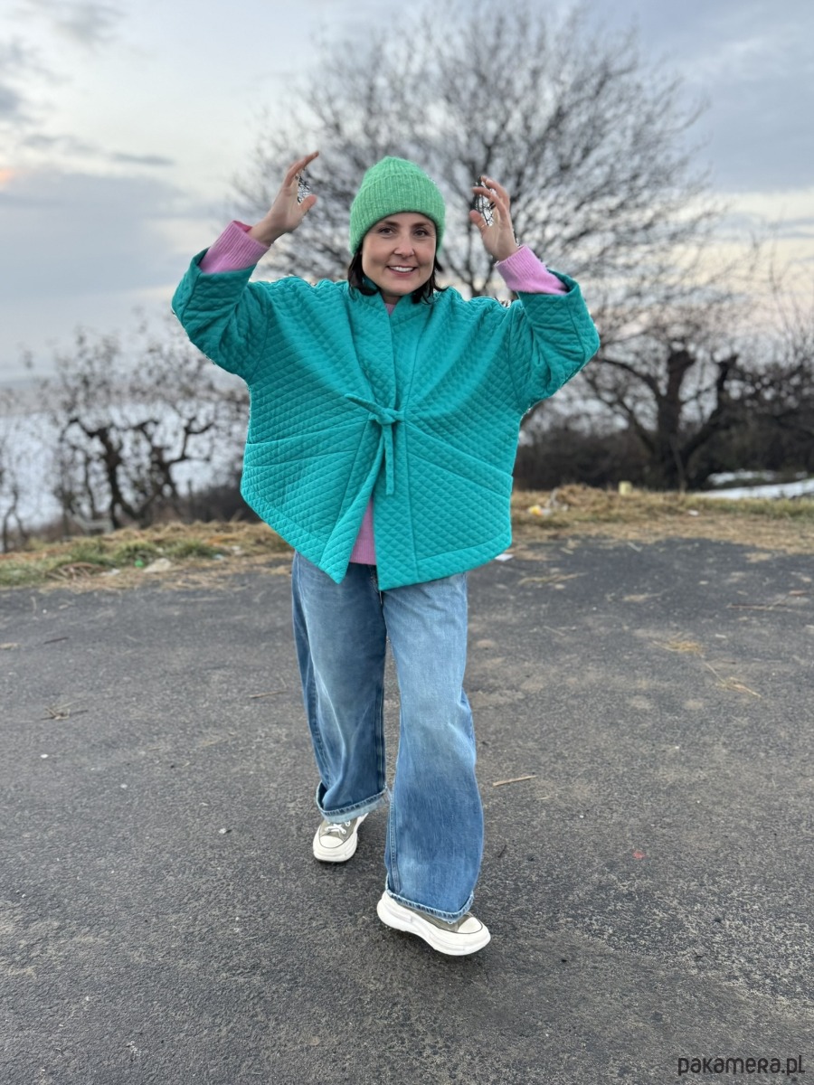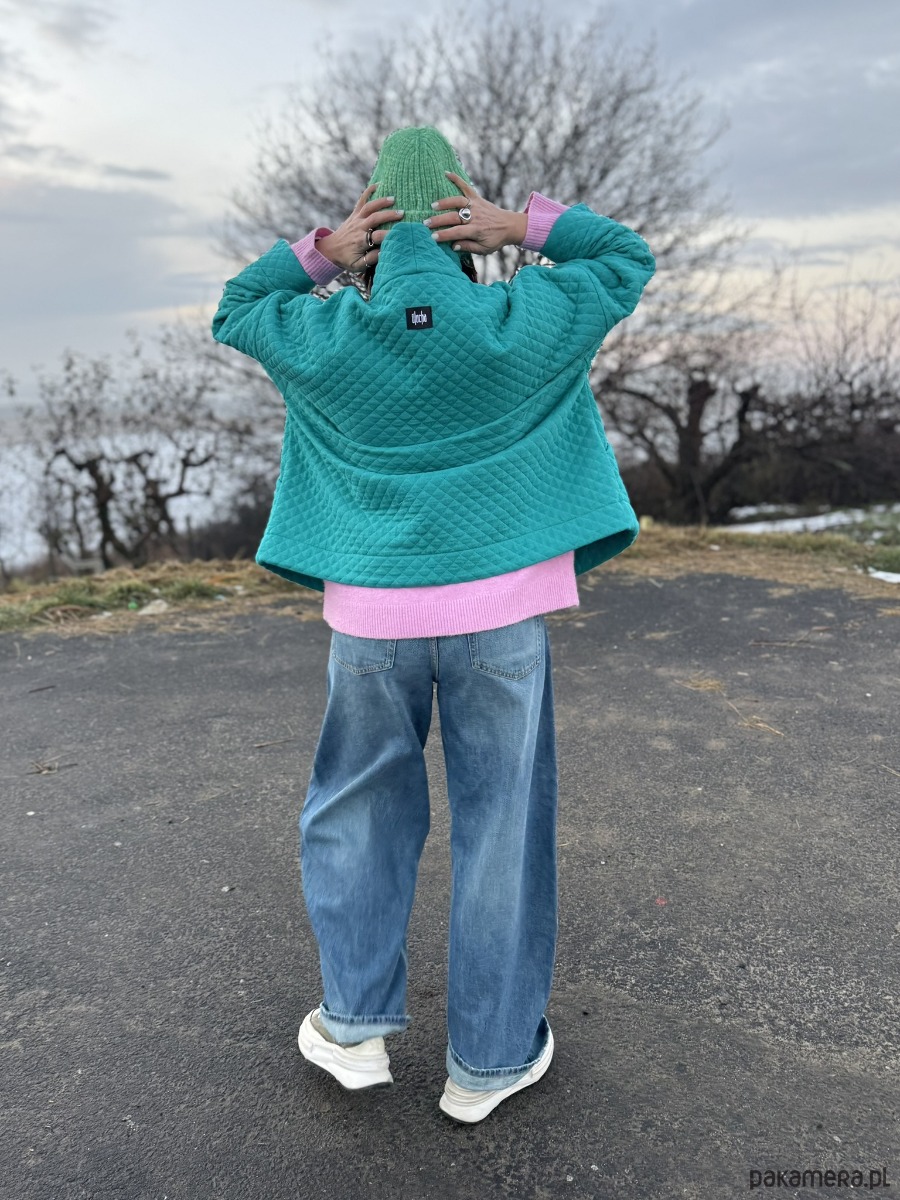 Ta pikowana kurtka została zaprojektowana z myślą o pełnym komforcie i swobodzie. Uszyta z miękkiej, turkusowej dzianiny o wyrazistym pikowaniu tworzy efekt otulenia, idealny na chłodniejsze dni. Jej oversize’owy krój sprawia, że można w niej poczuć się naprawdę swobodnie, bez względu na typ sylwetki.