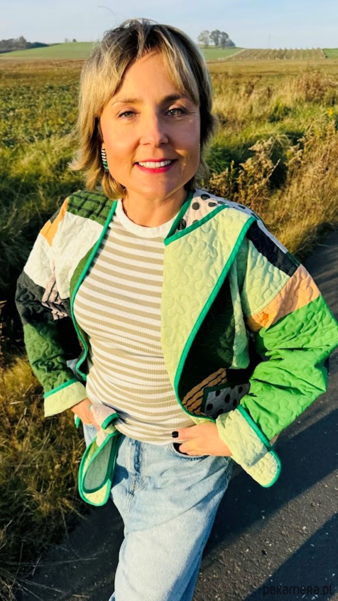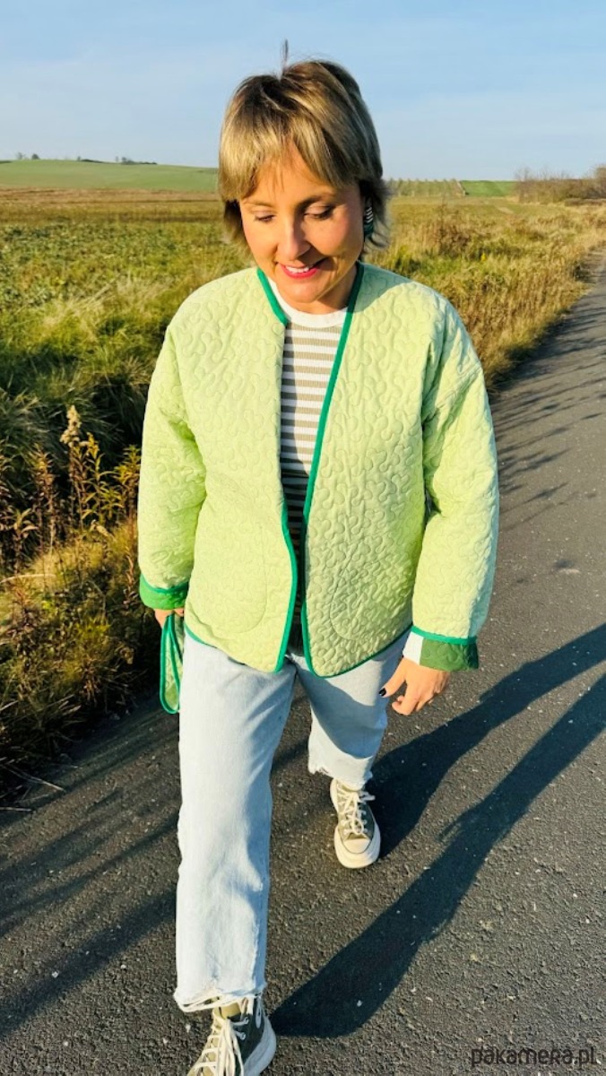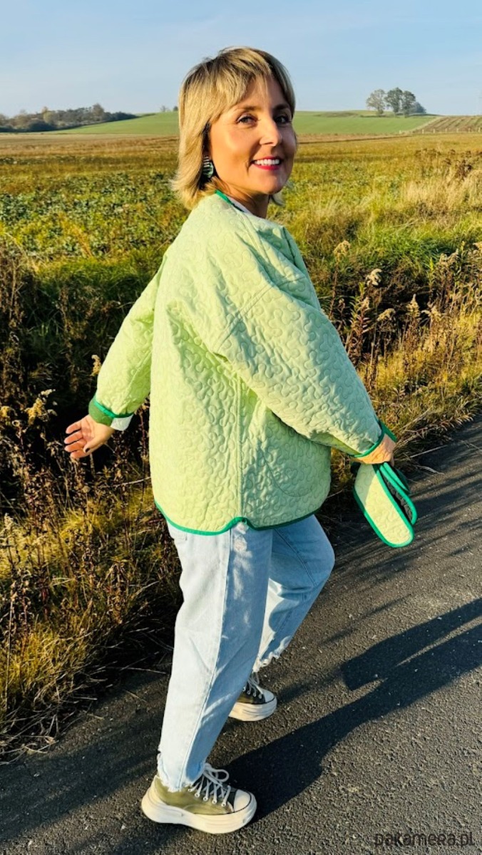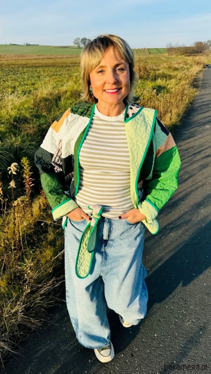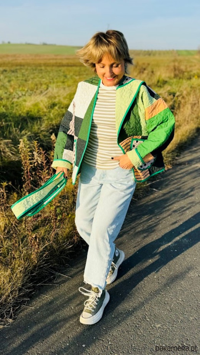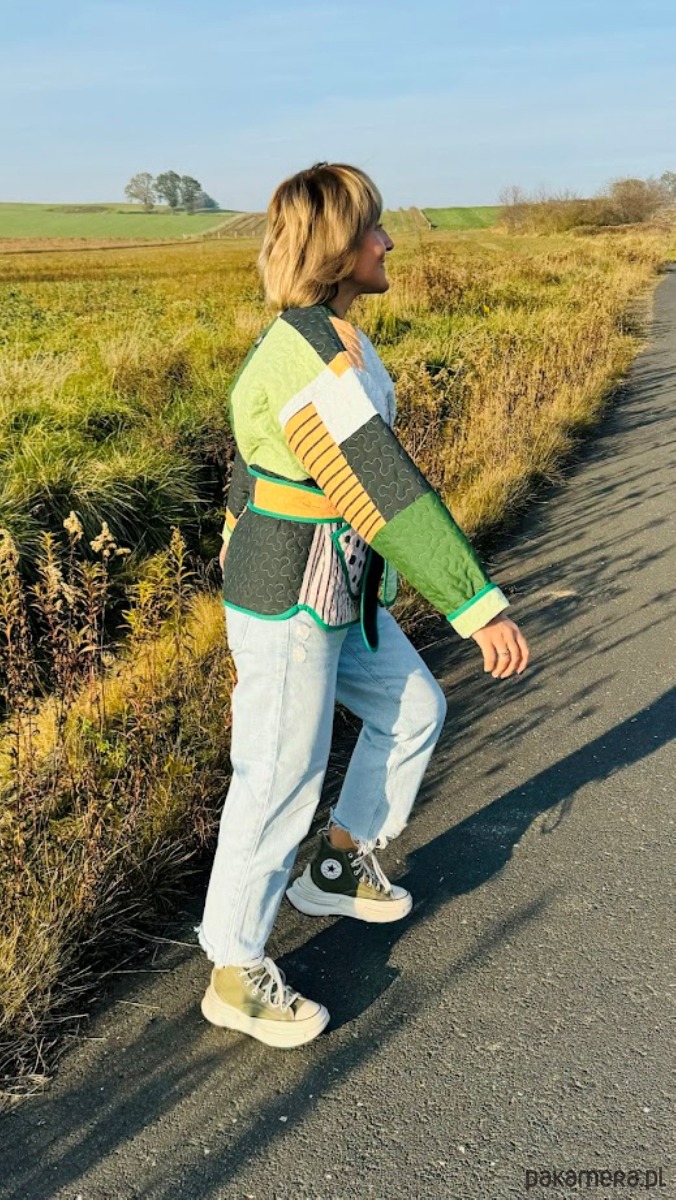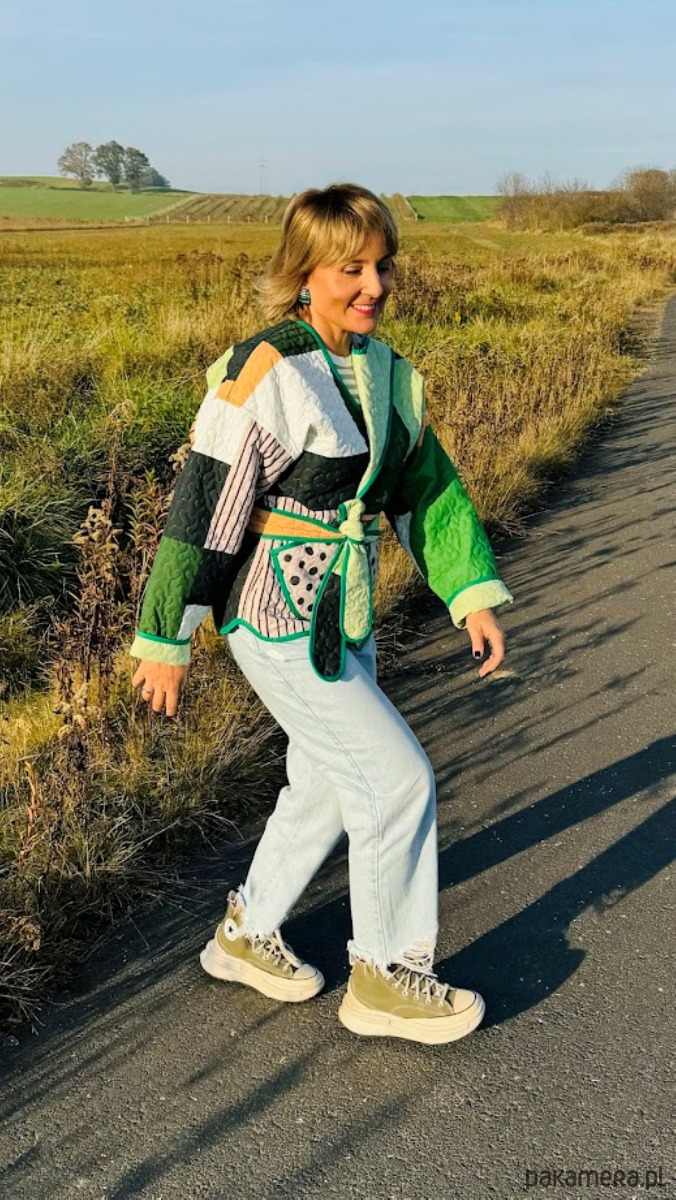 Kurtka jest dwustronn. — z jednej strony szalony, patchorkowy wzór, a z drugiej jednolity, zielony kolor. To świetna opcja na zmianę stylu w zależności od nastroju i okazji!