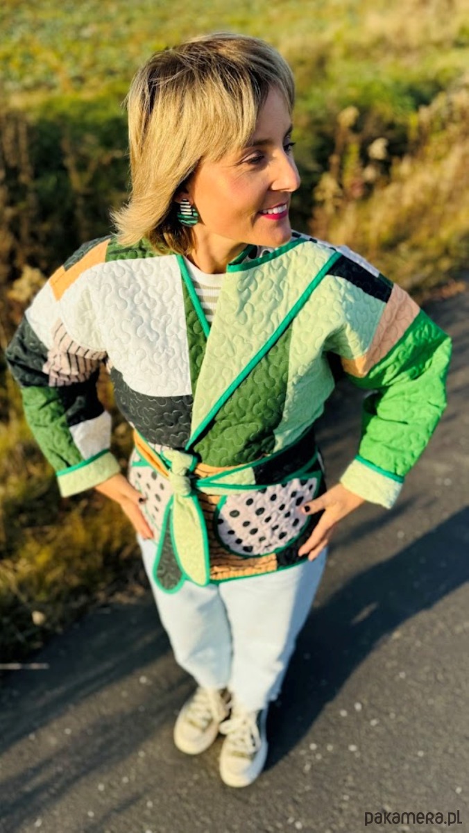 Pikowana patchworkowa kurtka z wiązaniem na pasek