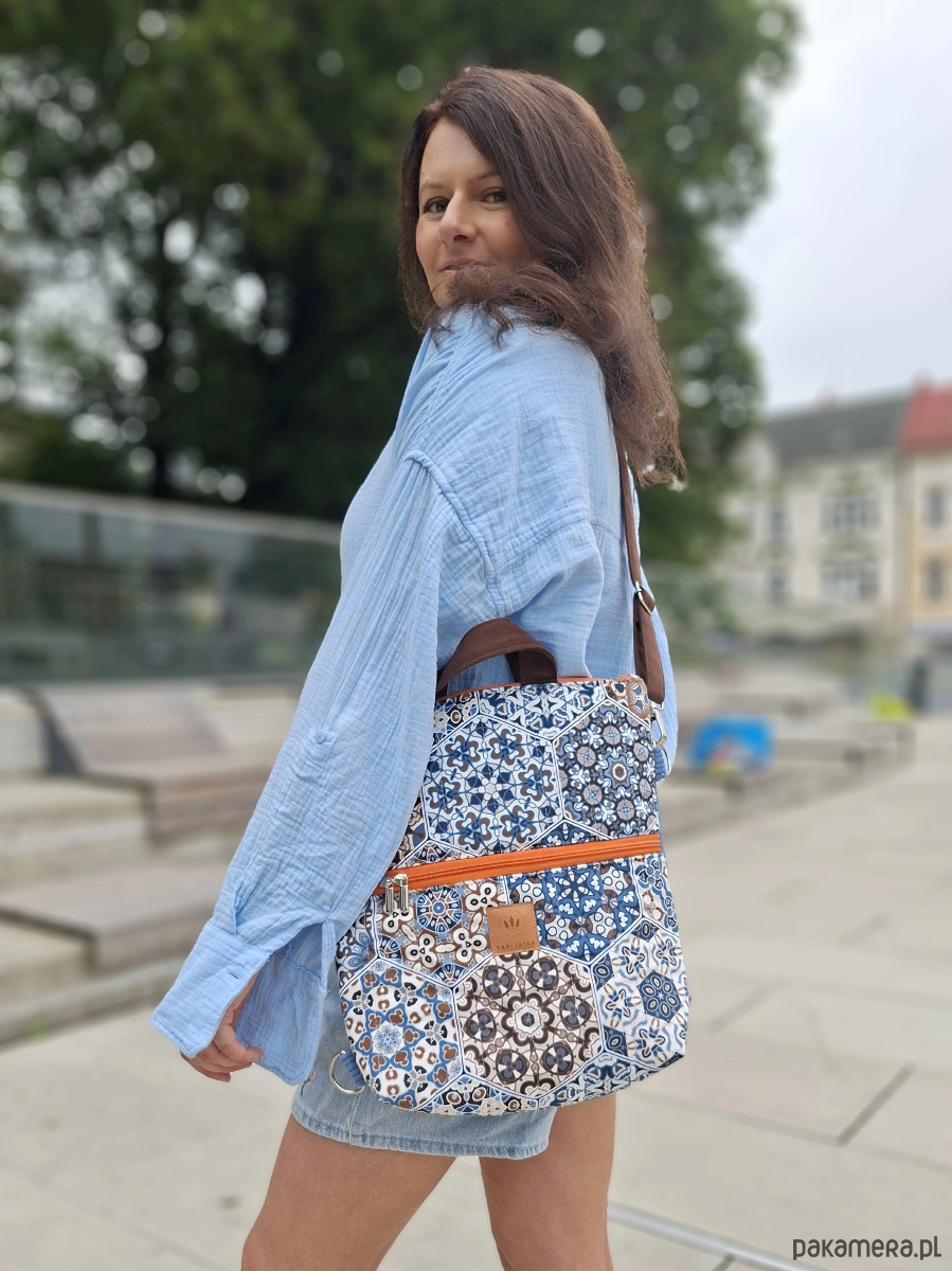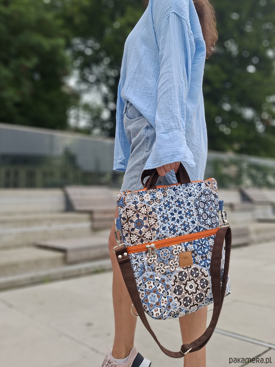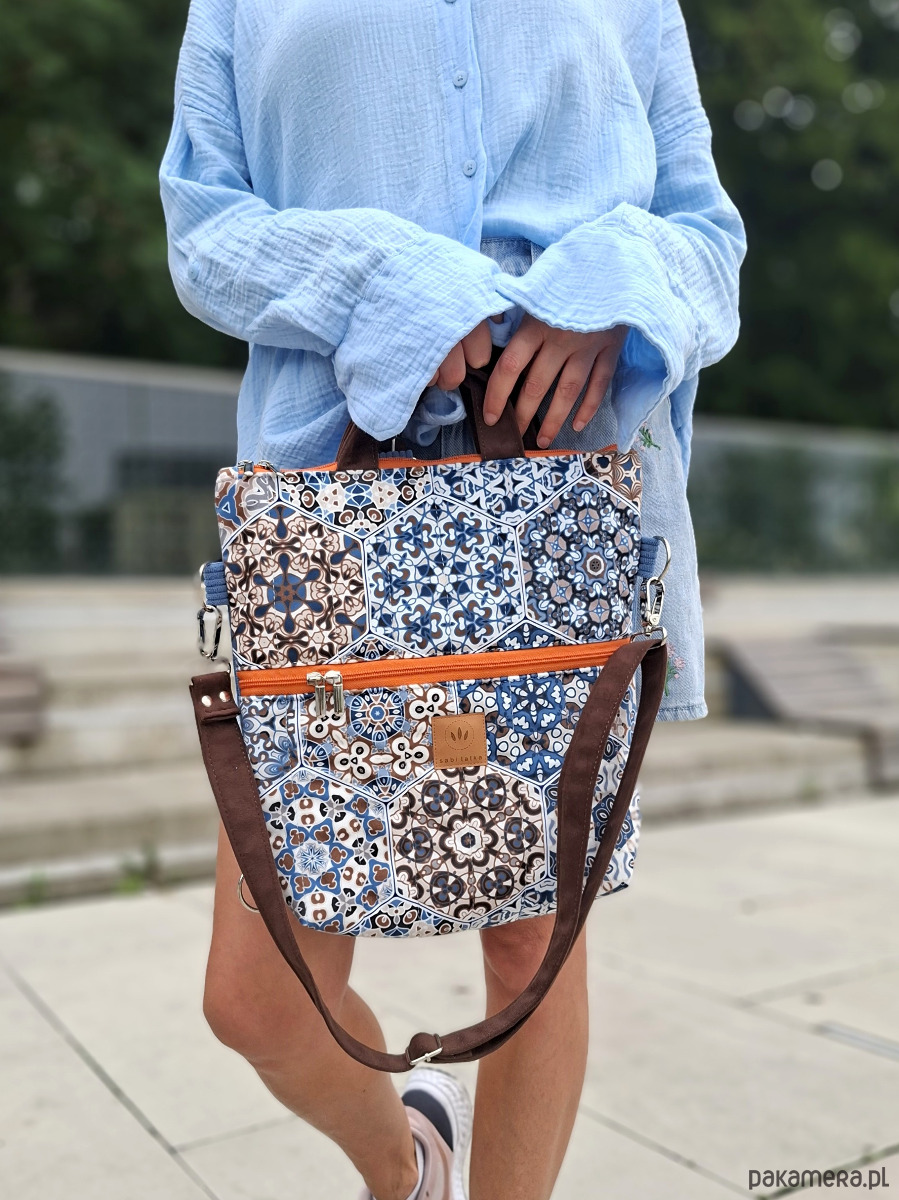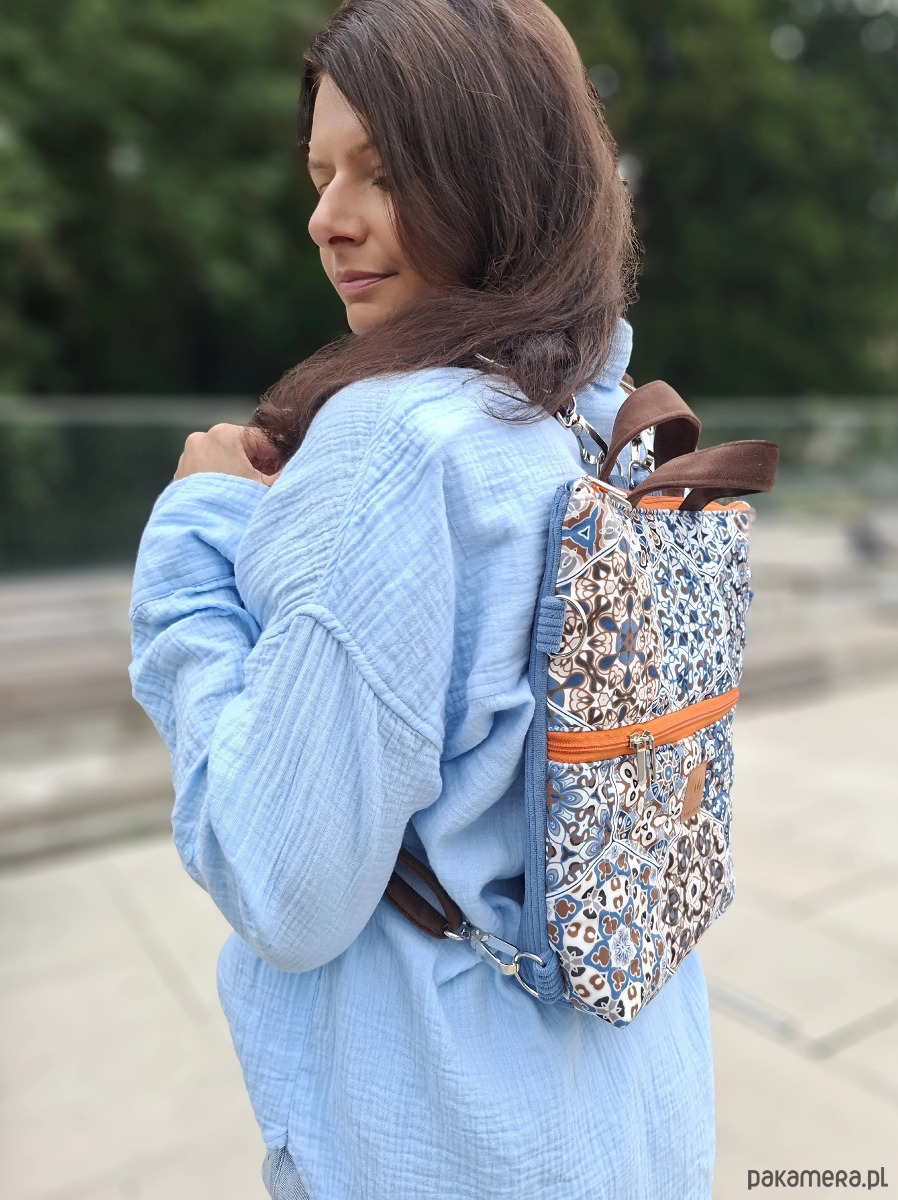 Torebko-plecak może służyć jako torebka albo jak plecak po przypięciu szelek do tyłu plecaka.