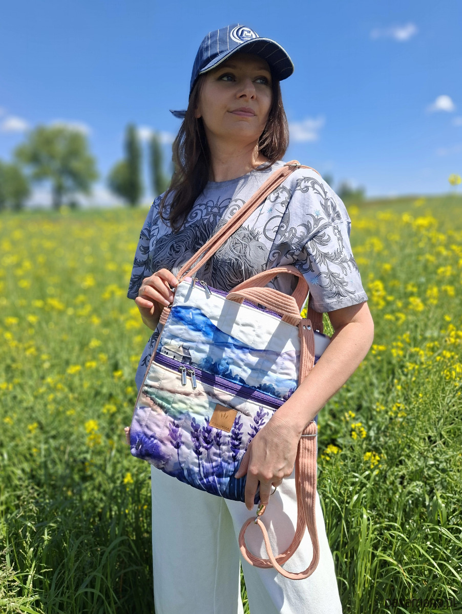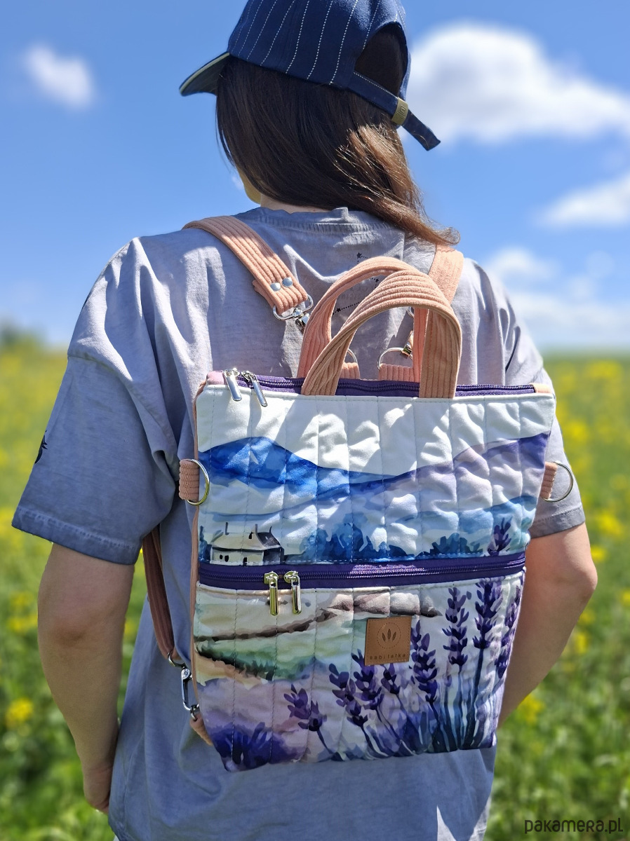 Torebko-plecak może służyć jako torebka albo jak plecak po przypięciu szelek do tyłu plecaka.