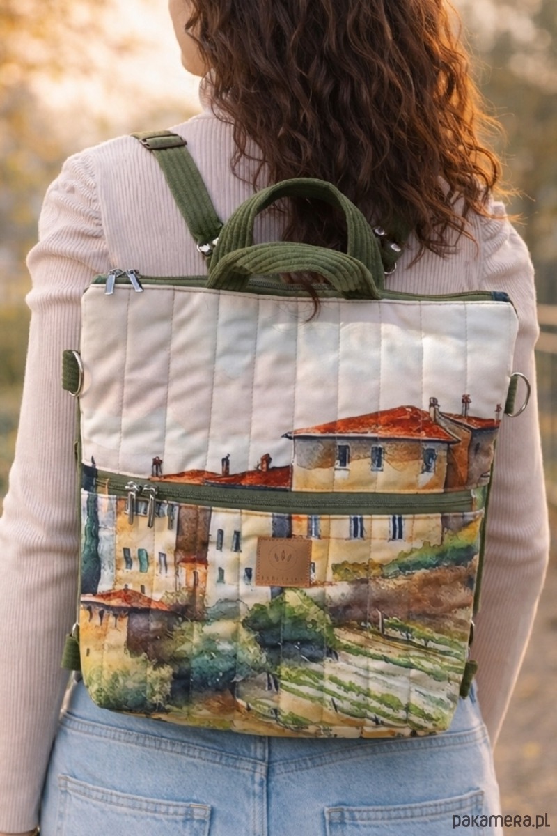 Torebko-plecak może służyć jako torebka albo jak plecak po przypięciu szelek do tyłu plecaka.