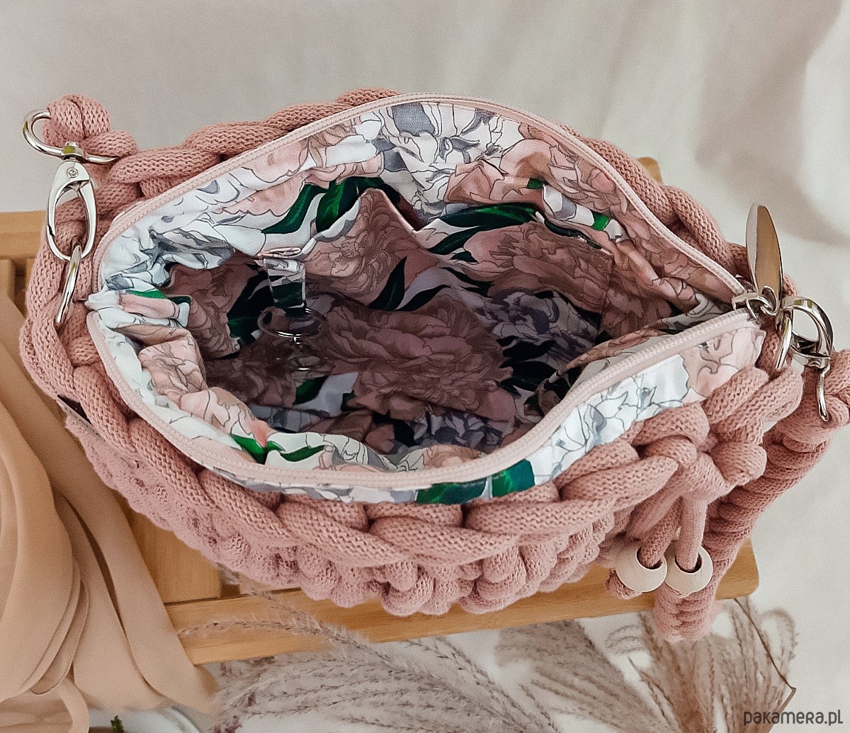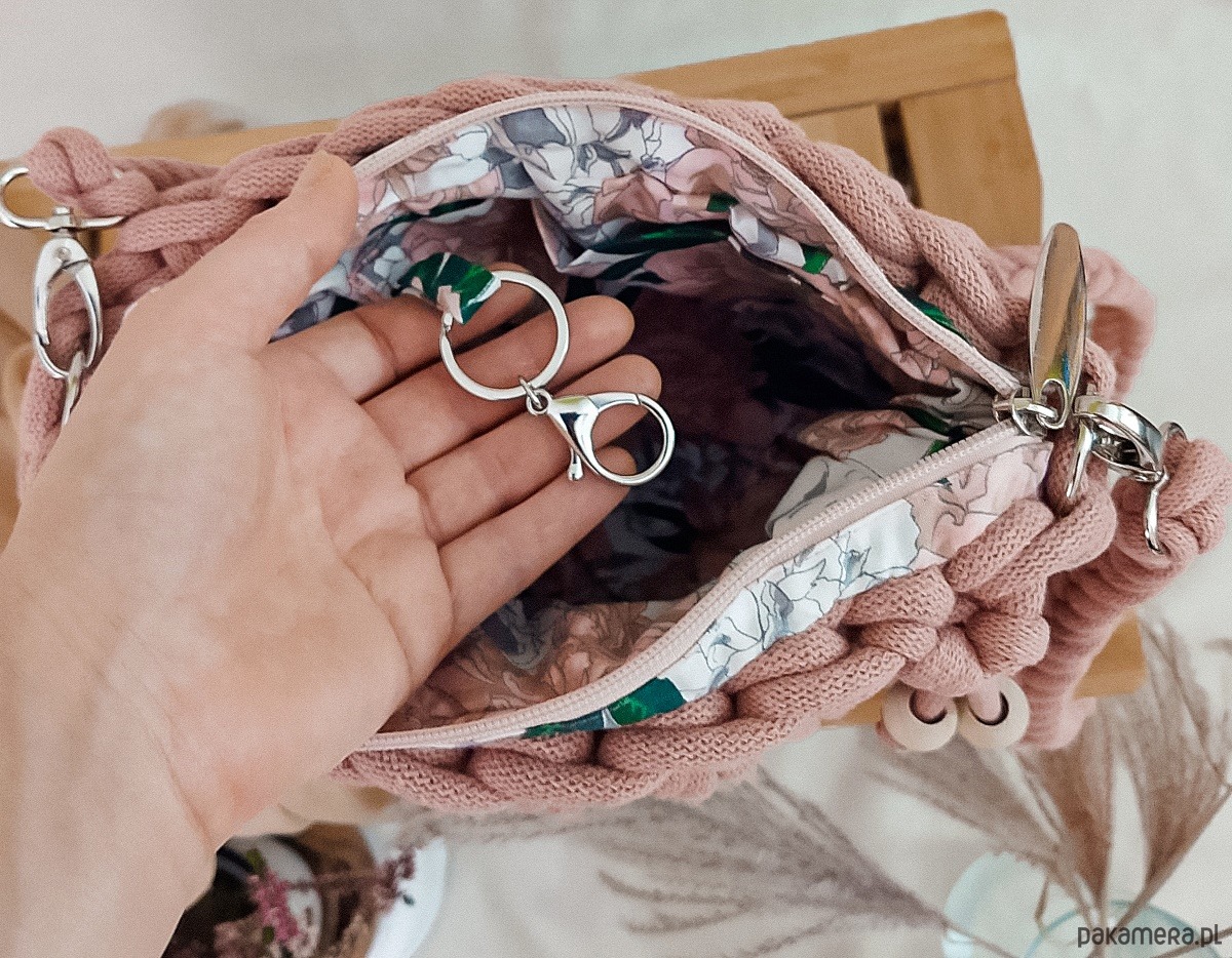 Torebka wykonana jest ręcznie z wysokiej jakości recyklingowego sznurka bawełnianego z certyfikatem STANDARD 100 by OEKO-TEX. Wewnątrz znajduje się dobrana pod kolor sznurka bawełniana, wzorzysta podszewka z kieszonką oraz karabińczykiem do przypięcia kluczy - dzięki temu zawsze będziesz wiedzieć gdzie są i obejdzie się bez zbędnego szukania.