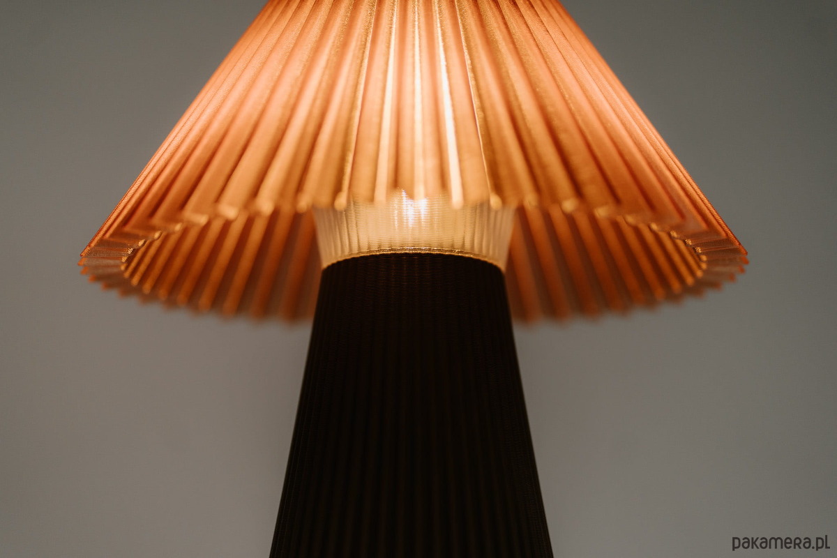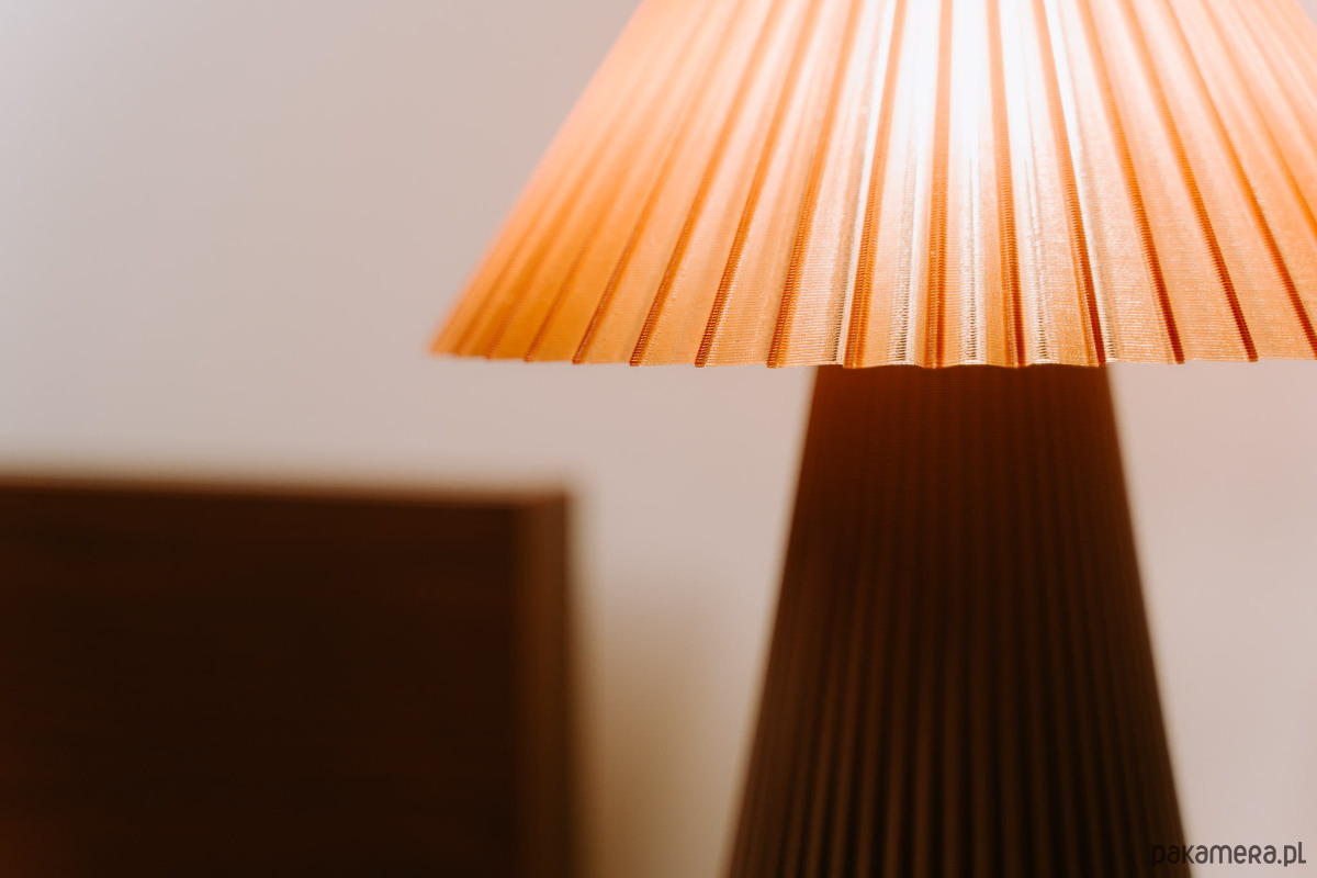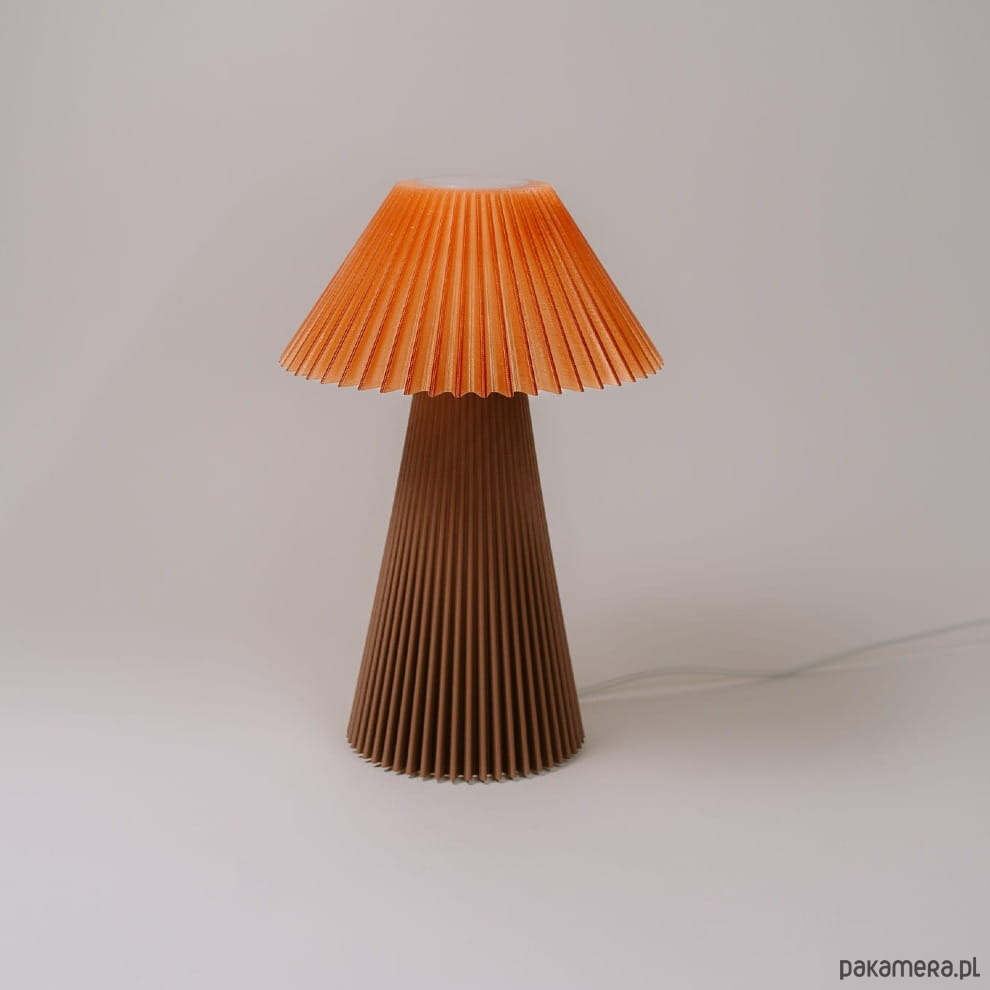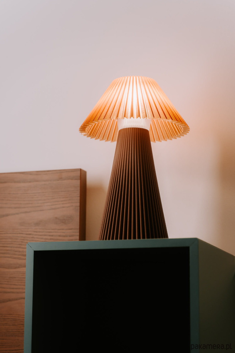 Lampa PILS Brown to połączenie sentymentu do plisowanych abażurów z precyzją druku 3D. Charakterystyczna, głęboka struktura klosza sprawia, że światło miękko rozprasza się po pomieszczeniu, tworząc przytulną i kojącą atmosferę. To projekt, który przyciąga wzrok detalami, a jednocześnie dba o Twój komfort po zmroku.
