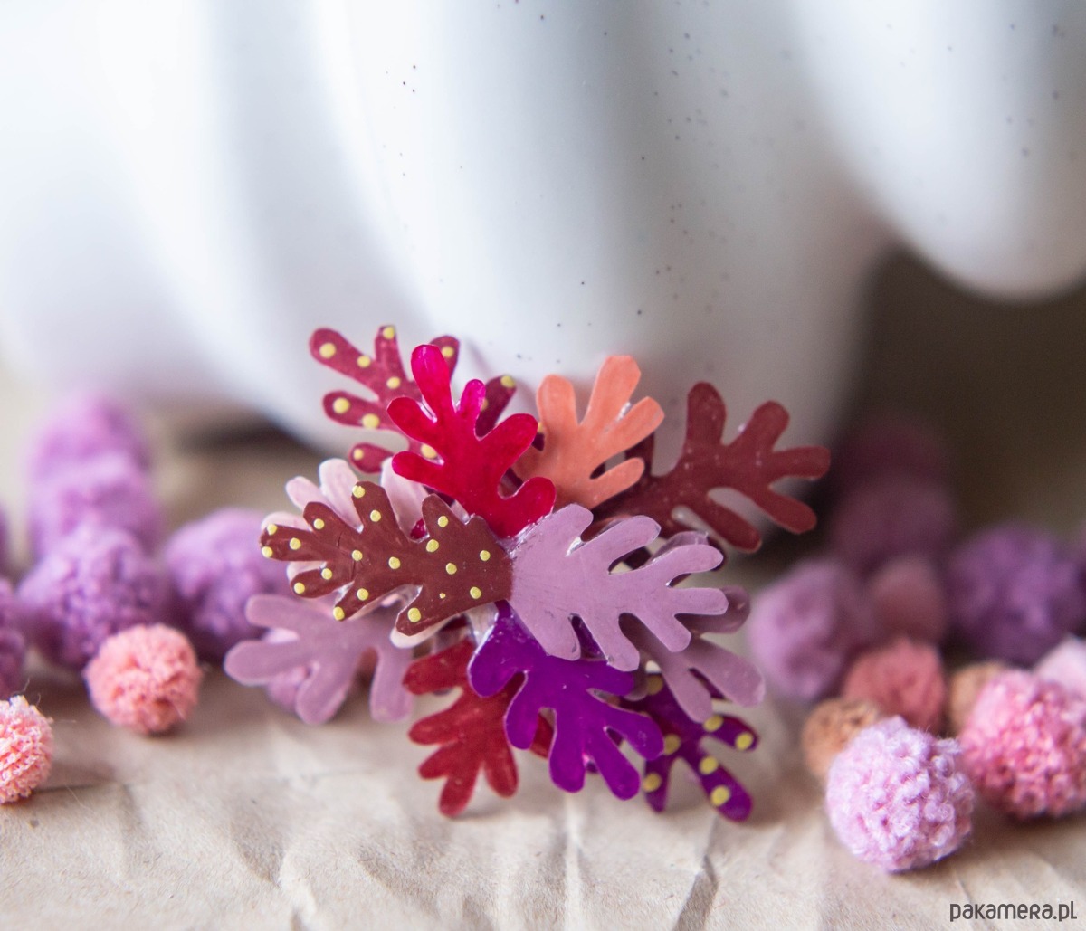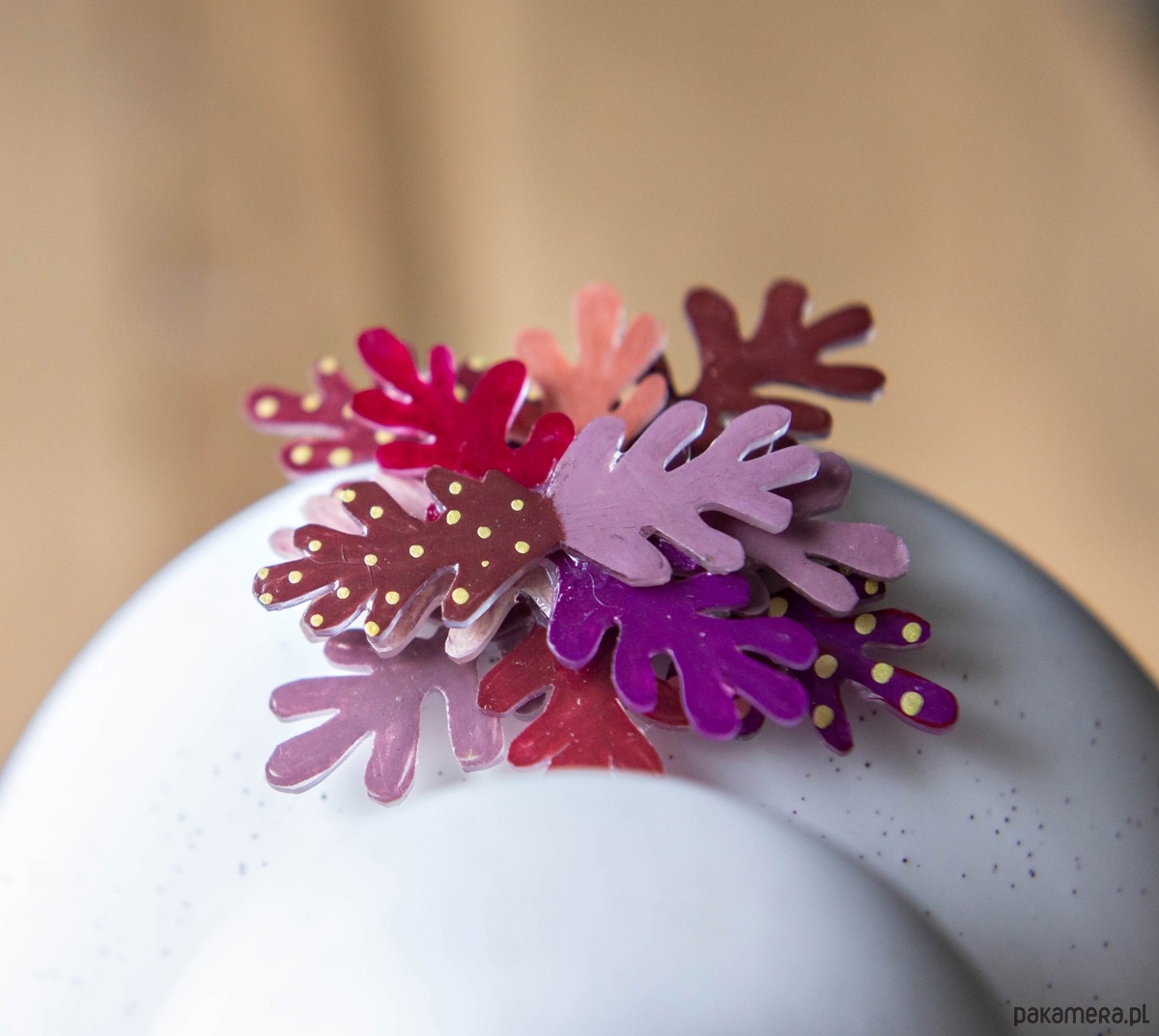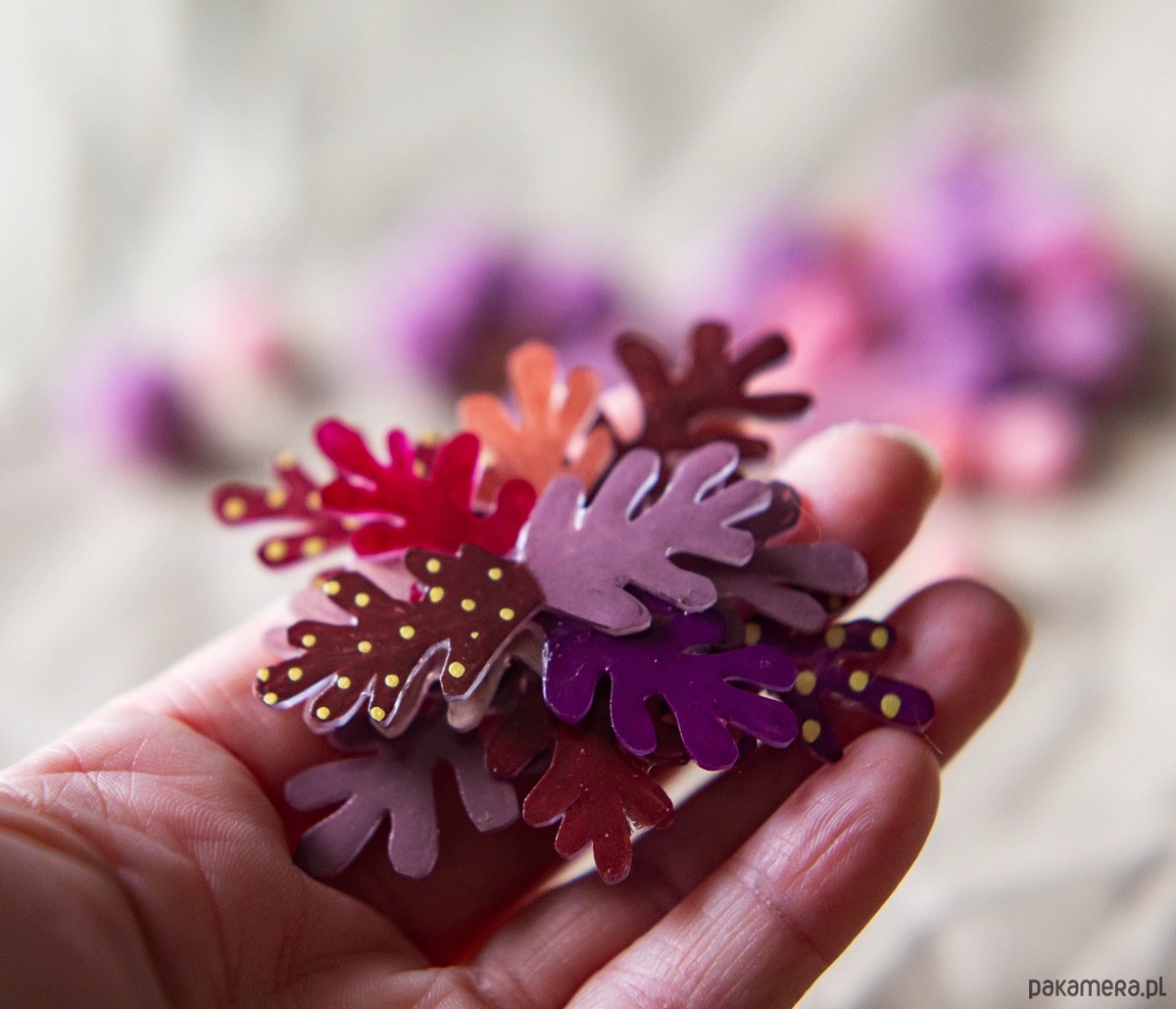 Ta przypinka to mała podwodna ekspedycja zamknięta w formie biżuterii. Stworzona z ręcznie rysowanych elementów, które następnie zostały wycięte, posklejane i ułożone warstwami, tworzy efekt trójwymiarowego, kołyszącego się wodorostowego bukietu. Każdy listek ma swój kształt, swój kolor i swoje „morskie” usposobienie — jedne wiją się z gracją, inne wyglądają, jakby właśnie plotkowały z rybkami.