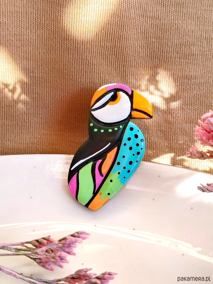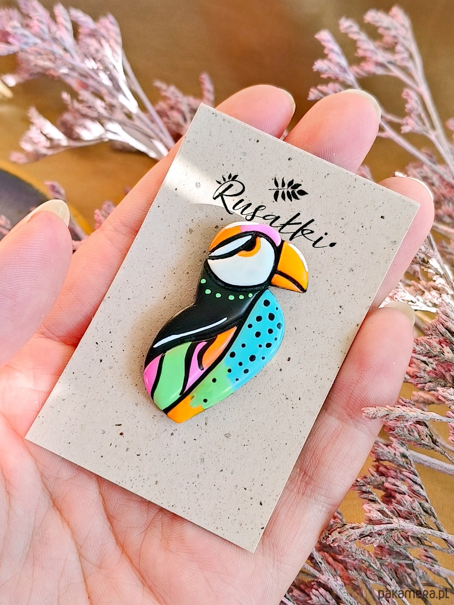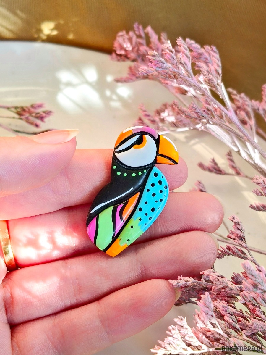 Pin z maskonurem to wyrazisty, artystyczny dodatek dla osób lubiących kolor i nietypowe motywy. Abstrakcyjna forma ptaka sprawia, że pin przyciąga uwagę i ożywia stylizację. To idealny prezent dla miłośników oryginalnej biżuterii i ptaków.