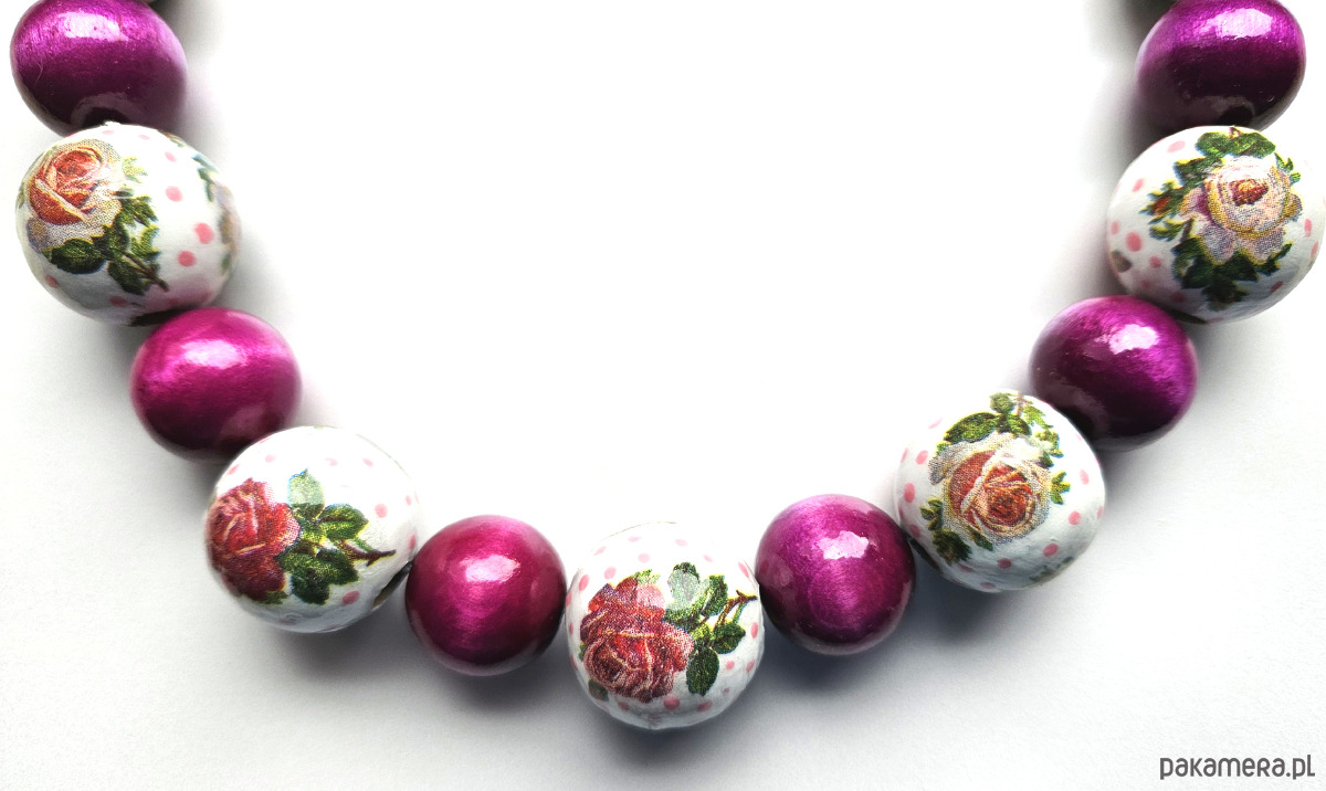 drewniane korale w kolorze purpurowym, ozdobione techniką decoupage, wykończone farbami akrylowymi i zabezpieczone lakierem, wielkość korali 25 mm i 20 mm, zapięcie posrebrzane, długość korali 50 cm + łańcuszek regulujący długość