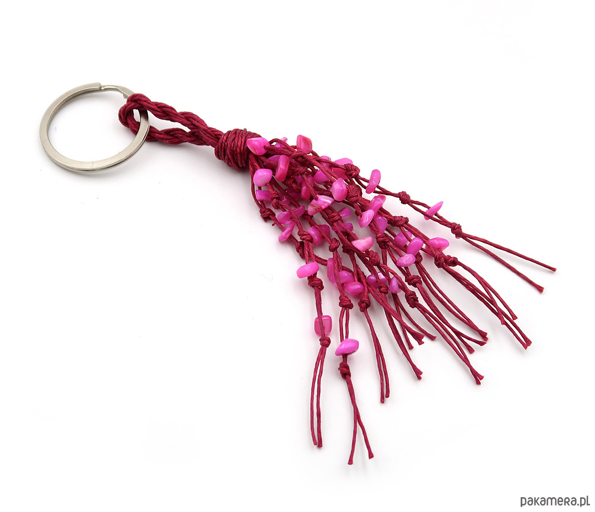 Ręcznie wykonany brelok stworzony z naturalnej, polskiej przędzy lnianej w głębokim odcieniu fuksji. Udekorowany został nieregularnymi bryłkami masy perłowej w intensywnym różu, które nadają mu lekkości i unikatowego charakteru.