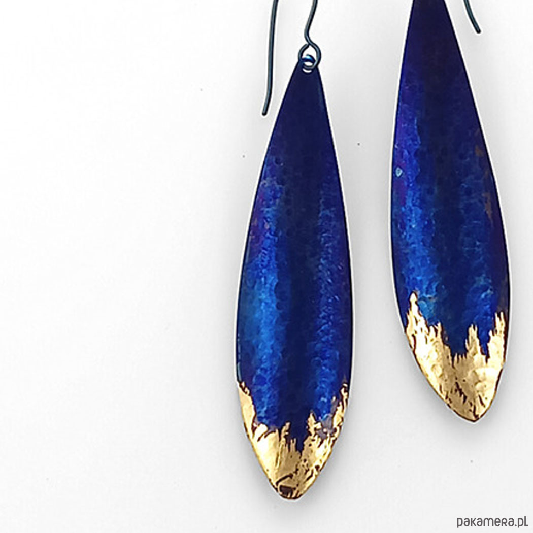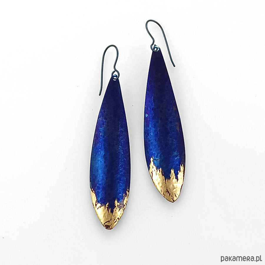 Kolczyki w całości wykonane z oksydowanego tytanu i pozłocone złotem płatkowym na końcach. Kolczyki razem z tytanowymi zawieszkami mają długość 7 cm ( z zawieszką 8 cm) i szerokość 1,7cm. Na odwrocie opatrzone wygrawerowanym autografem.Tytan jest niezwykle lekkim i trwałym metalem który nie wywołuje żadnych alergii-jest hipoalergiczny-stosowany w chirurgii i stomatologii. Odporny na działanie chemikaliów.