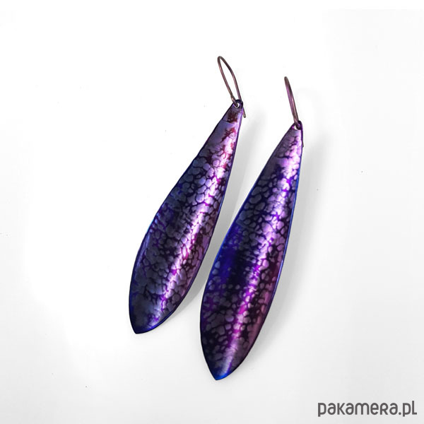 Kolczyki w całości wykonane z oksydowanego tytanu. Opatrzone grawerowanym podpisem.Długość z tytanowymi biglami ok.8 cm.(listki 7 cm)