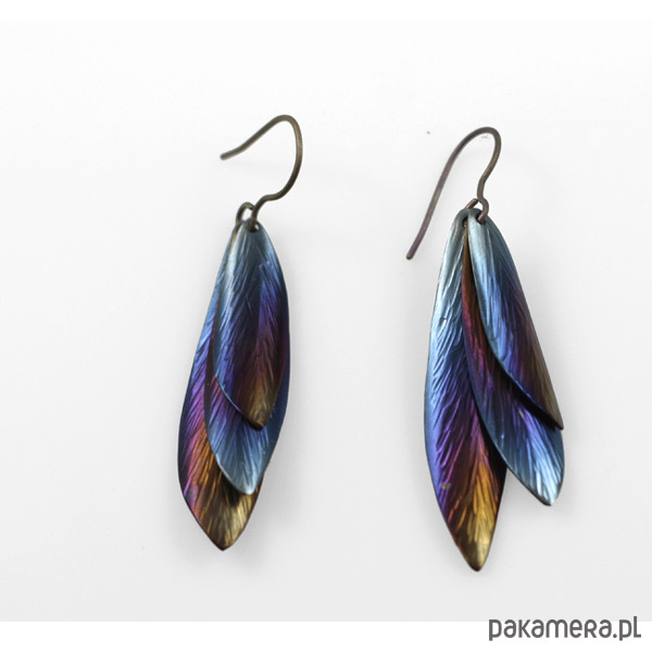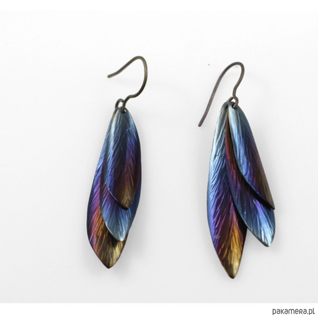 Kolczyki w całości wykonane z oksydowanego tytanu. Opatrzone grawerowanym podpisem.Długość z tytanowymi biglami ok.6 cm.