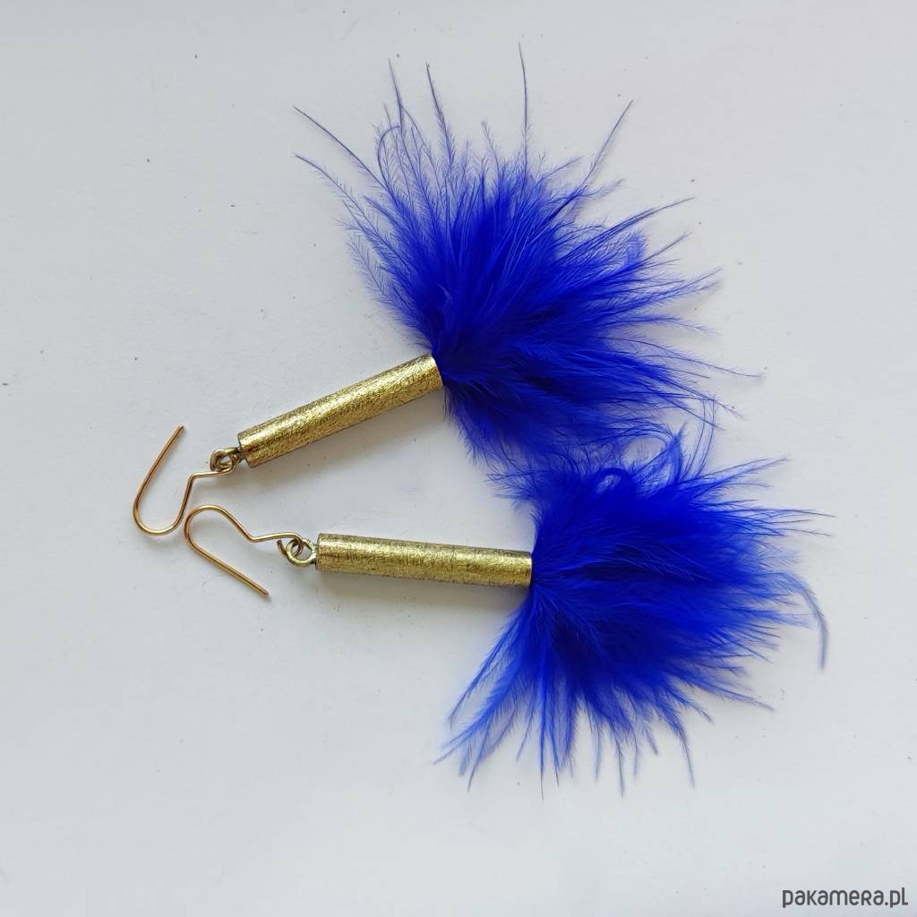 PIÓRKO - stylowy dodatek. Połączenie lekkości piórka i trwałości metalu. Metal niezwykle kontrastuje z naturalnym barwionym   puchem.   Kolczyki wykonane są z miedzi, naturalnie barwione pióra. Miedź -  zmatowiony. Bigle otwarte - srebro   pr.925. Długość z biglami - 7,5 cm.
