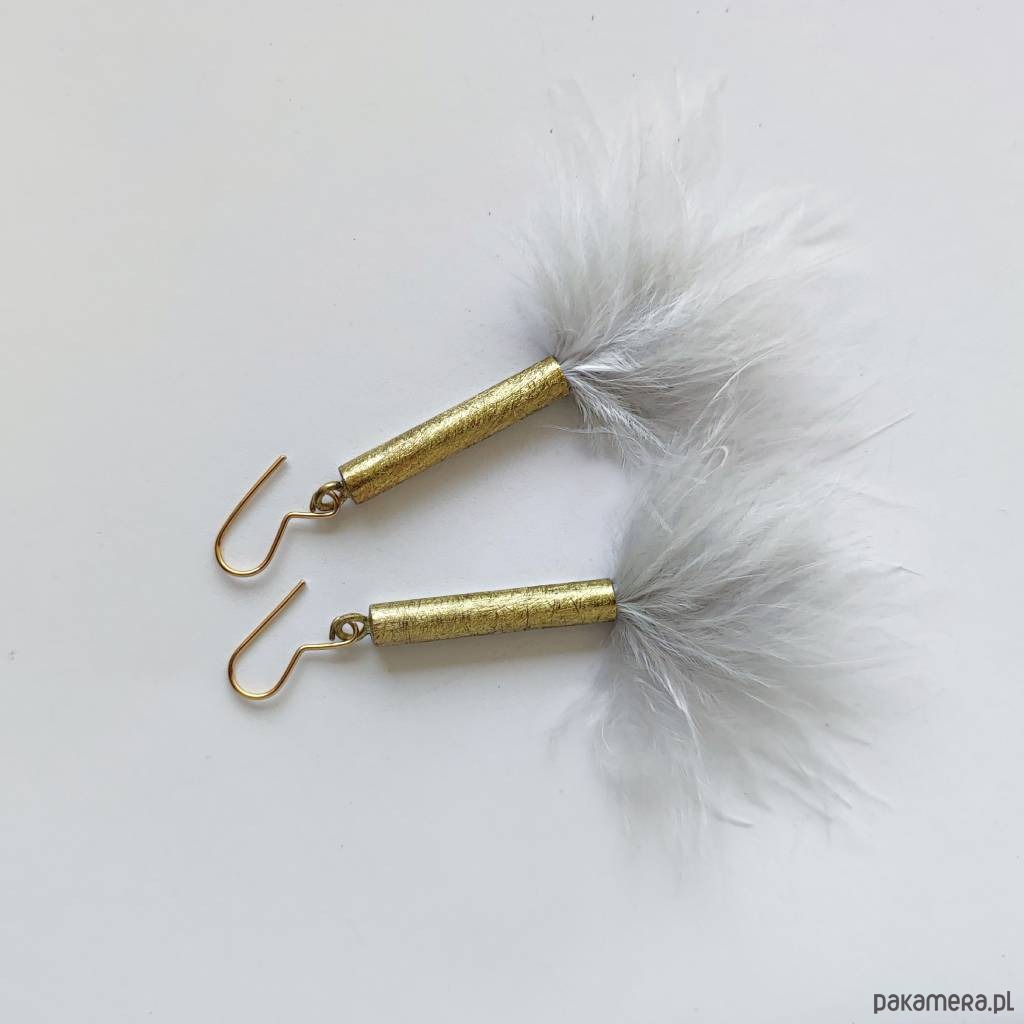 PIÓRKO - stylowy dodatek. Połączenie lekkości piórka i trwałości metalu. Metal niezwykle kontrastuje z naturalnym barwionym   puchem.   Kolczyki wykonane są z miedzi, naturalnie barwione pióra. Miedź -  zmatowiony. Bigle otwarte - srebro   pr.925. Długość z biglami - 7,5 cm.
