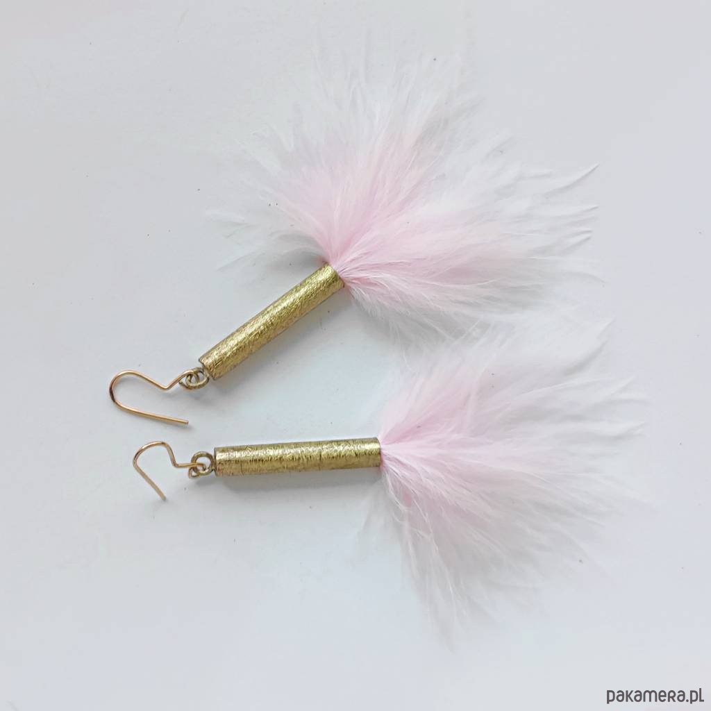 PIÓRKO - stylowy dodatek. Połączenie lekkości piórka i trwałości metalu. Metal niezwykle kontrastuje z naturalnym barwionym   puchem.   Kolczyki wykonane są z miedzi, naturalnie barwione pióra. Miedź -  zmatowiony. Bigle otwarte - srebro   pr.925. Długość z biglami - 7,5 cm.