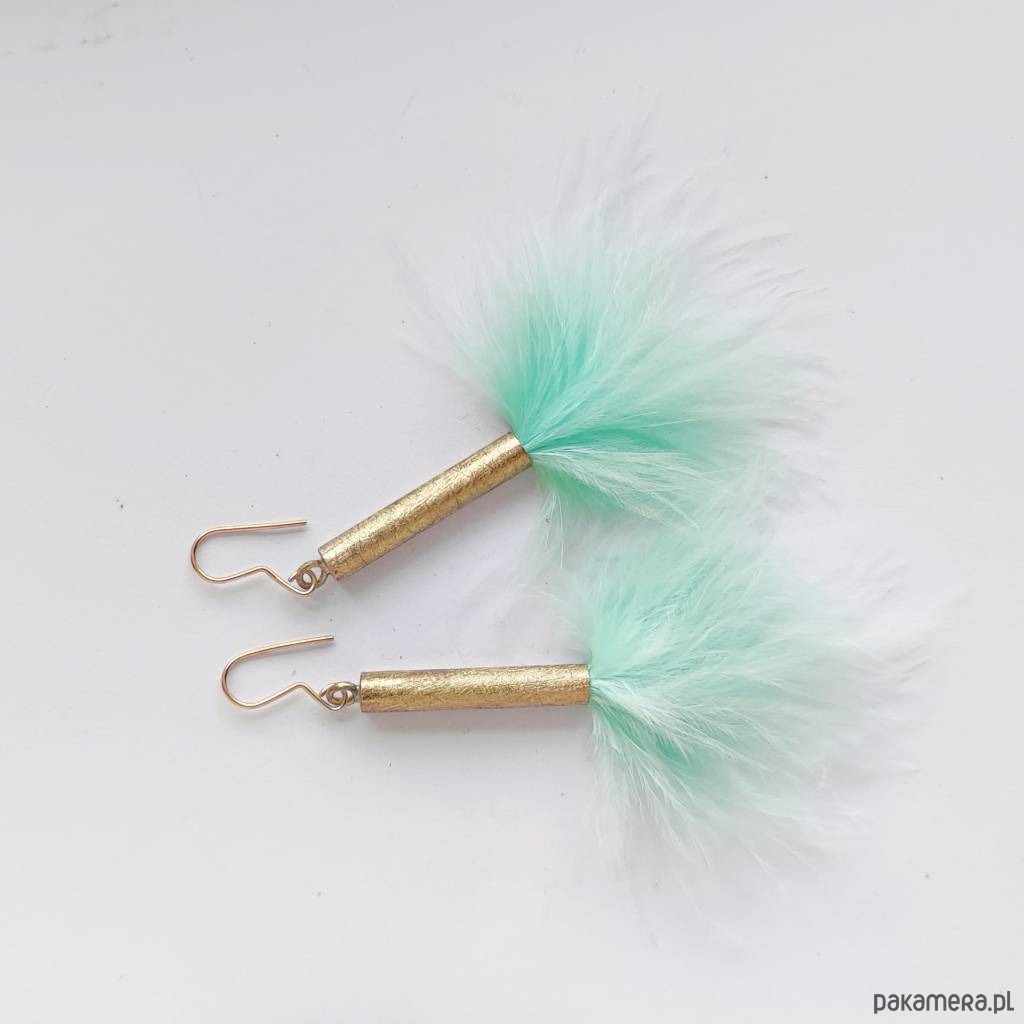 PIÓRKO - stylowy dodatek. Połączenie lekkości piórka i trwałości metalu. Metal niezwykle kontrastuje z naturalnym barwionym puchem. Kolczyki wykonane są z miedzi, naturalnie barwione pióra. Miedź - zmatowiony. Bigle otwarte - srebro pr.925. Długość z biglami - 7,5 cm.