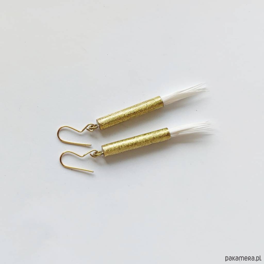 PIÓRKO - stylowy dodatek. Połączenie lekkości piórka i trwałości metalu. Metal niezwykle kontrastuje z naturalnym barwionym puchem. Kolczyki wykonane są z miedzi, naturalnie barwione pióra. Miedź - zmatowiony. Bigle otwarte - srebro pr.925. Długość z biglami - 5,5 cm. Szerokość - 1,5 cm. Waga - ok. 2,5 g.