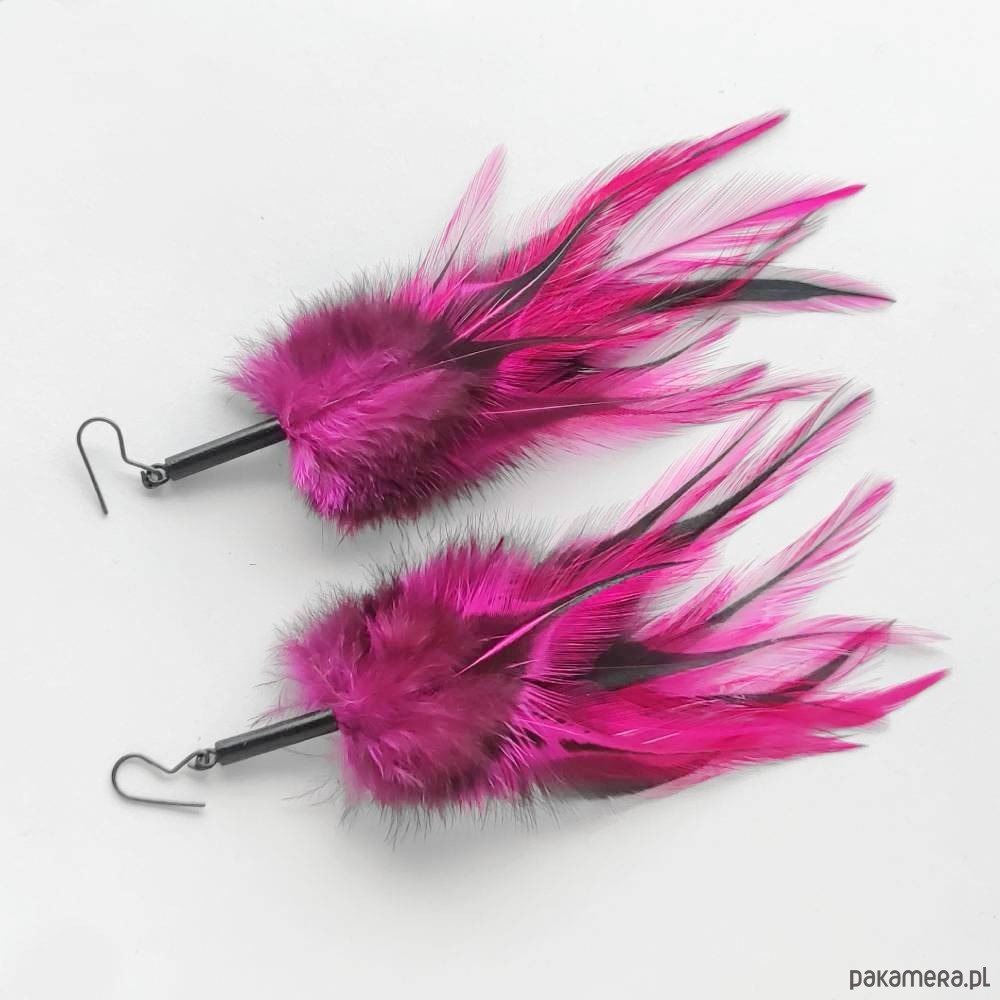PIÓRKO – stylowy dodatek. Kolczyki są lekkie, zwracają uwagę Idealne dla kobiet, które uwielbiają bawić się modą . Połączenie lekkości piórka i trwałości metalu. Metal niezwykle kontrastuje z naturalnym barwionym puchem. Kolczyki wykonane są z mosiądzu, naturalnie barwione pióra. Mosiądz – zmatowiony, oksydowany. Bigle otwarte – srebro pr.925,oksydowane. Długość z biglami – ok. 11 cm.