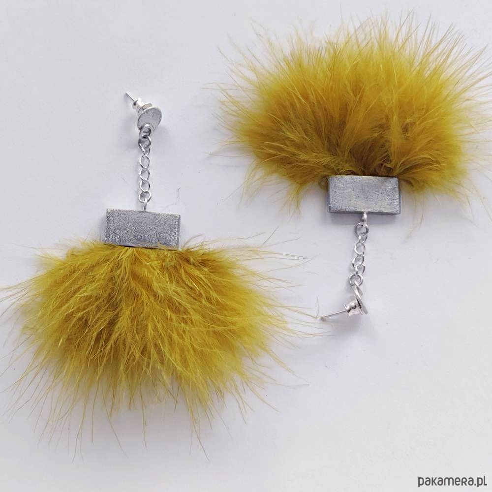 PIÓRKO - stylowy dodatek. Połączenie lekkości piórka i trwałości metalu. Metal niezwykle kontrastuje z naturalnym barwionym puchem. Kolczyki na sztyftach wykonane są z alpaki, srebro ( pr.925), naturalnie barwione pióra. Alpaka - zmatowiona. Długość z ok.9 cm. Szerokość - 5,5 cm.