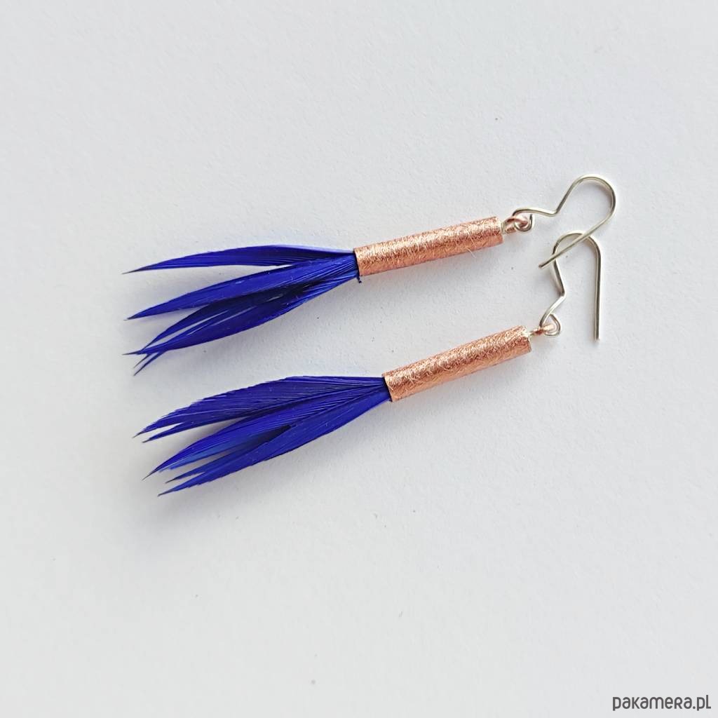 PIÓRKO - stylowy dodatek. Połączenie lekkości piórka i trwałości metalu. Metal niezwykle kontrastuje z naturalnym barwionym puchem. Kolczyki wykonane są z miedzi, naturalnie barwione pióra. Miedź - zmatowiony. Bigle otwarte - srebro pr.925. Długość z biglami - 7,5 cm. Szerokość - 2cm.