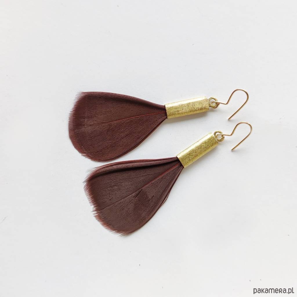 PIÓRKO - stylowy dodatek. Połączenie lekkości piórka i trwałości metalu. Metal niezwykle kontrastuje z naturalnym barwionym puchem. Kolczyki wykonane są z : mosiądz, naturalne barwione pióra. Mosiądz : zmatowiona. Bigle otwarte - srebro pr.925 pozłacane. Długość z biglami - 7 cm. Szerokość ok. 3cm.