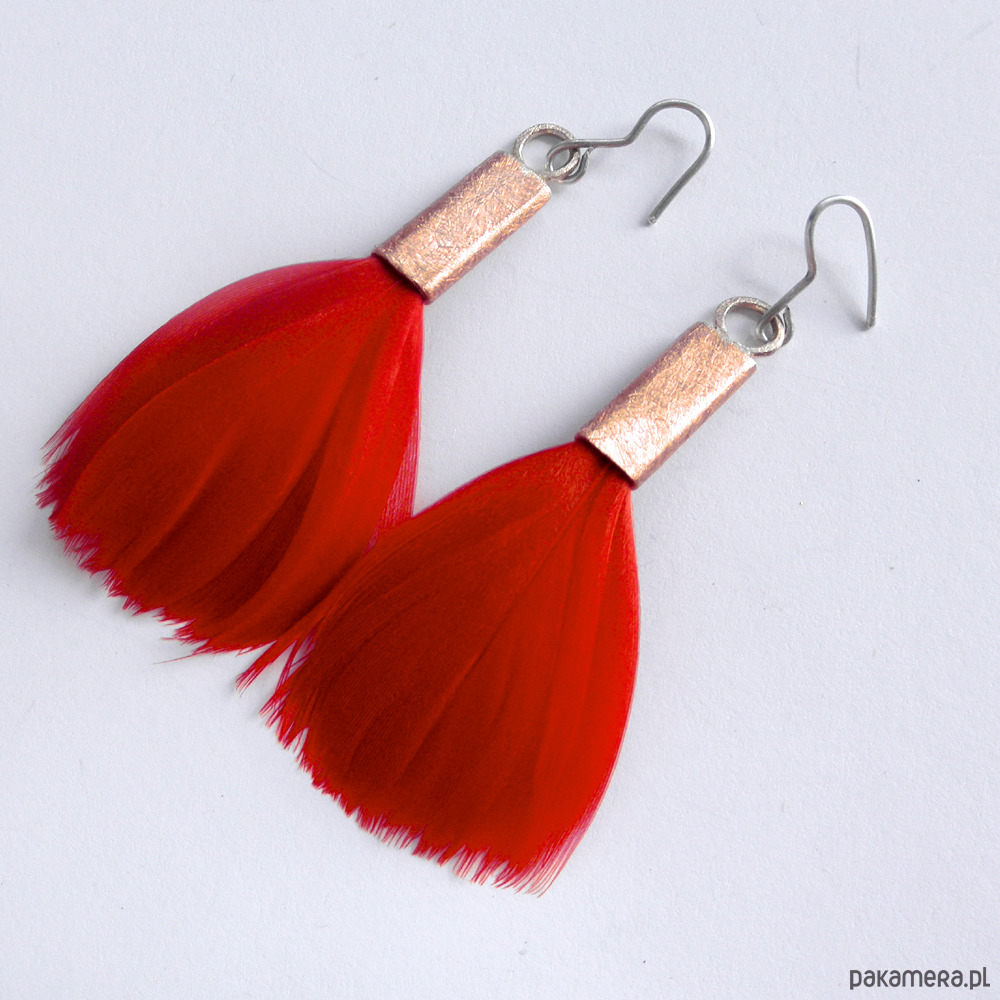 PIÓRKO - stylowy dodatek. Połączenie lekkości piórka i trwałości metalu. Metal niezwykle kontrastuje z naturalnym barwionym puchem. Kolczyki wykonane są z miedzi, naturalnie barwione pióra. Miedź - zmatowiony. Bigle otwarte - srebro pr.925. Długość z biglami - 7,5 cm. Szerokość - 3 cm. Waga - ok. 2,5 g.
