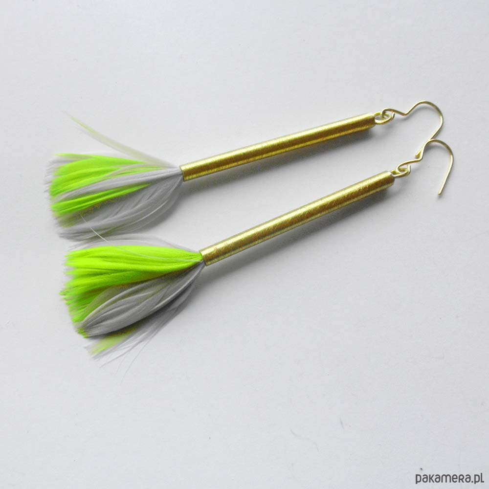 PIÓRKO - stylowy dodatek. Połączenie lekkości piórka i trwałości metalu. Metal niezwykle kontrastuje z naturalnym barwionym puchem. Kolczyki wykonane są z mosiądzu, naturalnie barwione pióra. Mosiądz - zmatowiony. Bigle otwarte - srebro pr.925, pozłacane. Długość z biglami - ok. 10 cm. Szerokość - 2 cm.