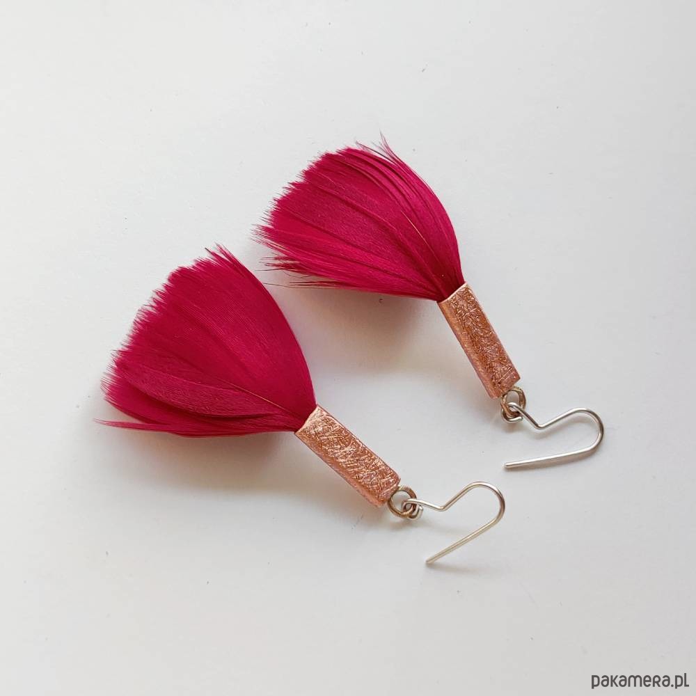 PIÓRKO - stylowy dodatek. Połączenie lekkości piórka i trwałości metalu. Metal niezwykle kontrastuje z naturalnym barwionym puchem. Kolczyki wykonane są z miedzi, naturalnie barwione pióra. Miedź - zmatowiony. Bigle otwarte - srebro pr.925. Długość z biglami - 7,5 cm. Szerokość - 3 cm. Waga - ok. 2,5 g.