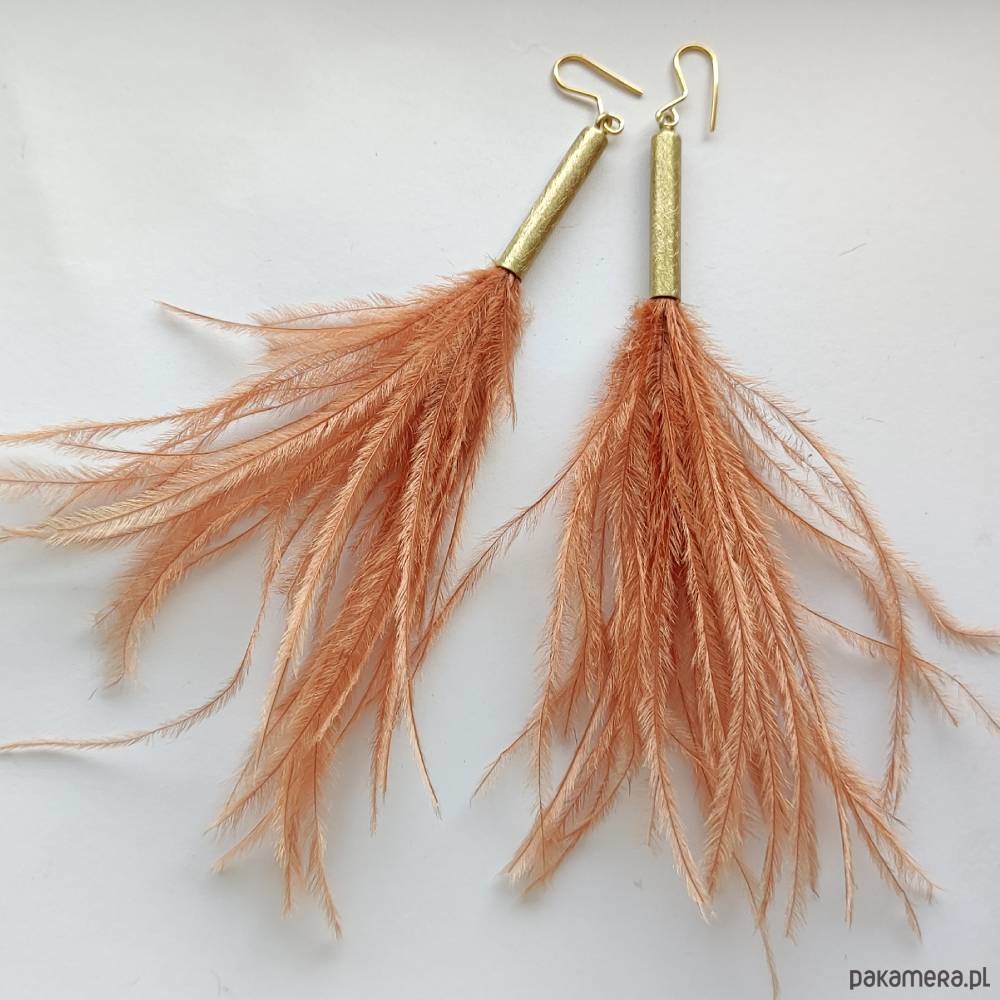 PIÓRKO - stylowy dodatek. Połączenie lekkości piórka i trwałości metalu. Metal niezwykle kontrastuje z naturalnym barwionym puchem. Kolczyki wykonane są z mosiądz, naturalnie barwione pióra. Mosiądz - zmatowiony. Bigle otwarte - srebro pr.925, pozłacane. Długość z biglami - 15 cm.