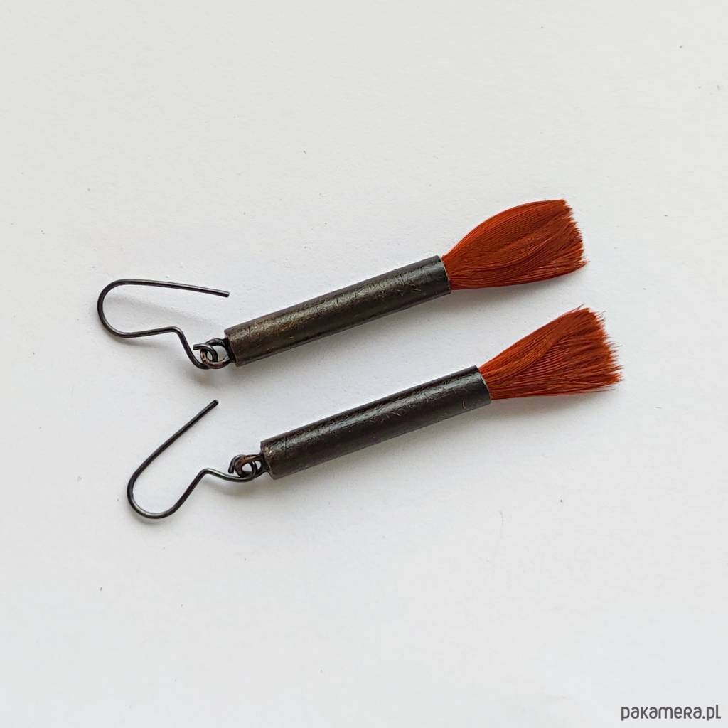 PIÓRKO - stylowy dodatek. Połączenie lekkości piórka i trwałości metalu. Metal niezwykle kontrastuje z naturalnym barwionym puchem. Kolczyki wykonane są z mosiądz, naturalnie barwione pióra. Mosiądz - zmatowiony, oksydowane, przecierane. Bigle otwarte - srebro pr.925 oksydowane. Długość z biglami - 5 cm.