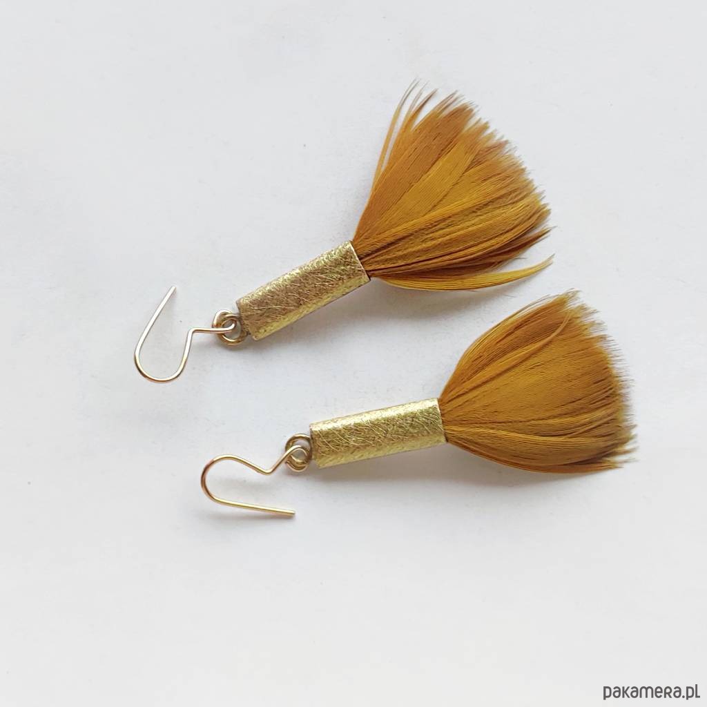 PIÓRKO - stylowy dodatek. Połączenie lekkości piórka i trwałości metalu. Metal niezwykle kontrastuje z naturalnym barwionym puchem. Kolczyki wykonane są z mosiądz, naturalnie barwione pióra. Mosiądz - zmatowiony. Bigle otwarte - srebro pr.925 pozłacane. Długość z biglami - 7,5 cm. Szerokość - 3 cm. Waga - ok. 2,5 g.